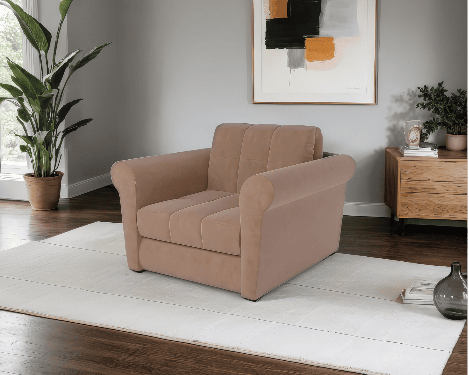 Кресло-кровать «Гранд» оснащен удобной спинкой и высокими подлокотниками, обеспечивающими надежную поддержку позвоночнику и рукам при просмотре телевизора или чтении книги.