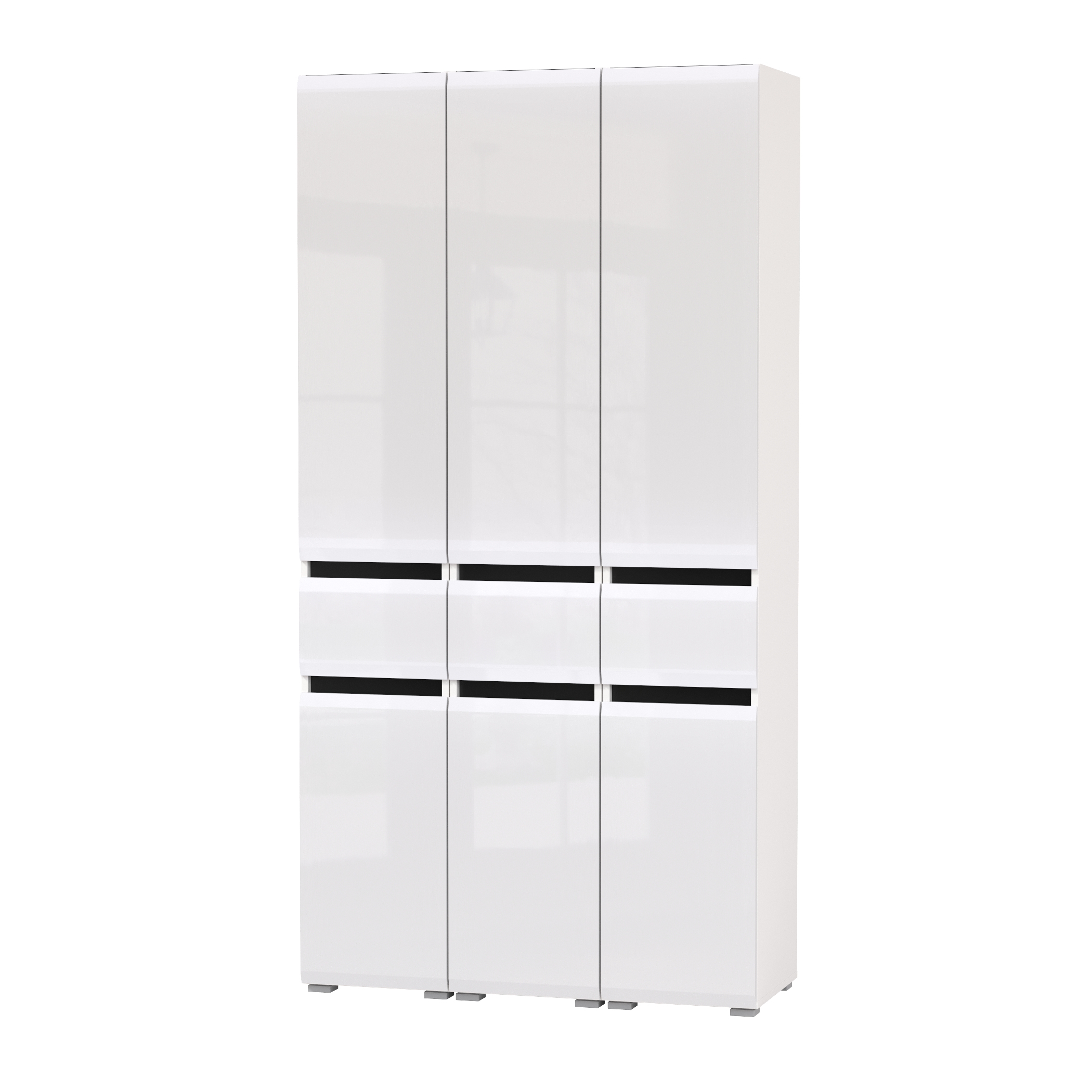 Каждый узкий шкаф Сидней 13.202 (в комплектации 3 единицы) состоит из верхнего и нижнего отделений с полками за дверкой и выдвижным ящиком по центру на шариковых направляющих. В верхнем отделении три полки, в нижней 1 полочка. Чёрная задняя стенка эффектно подчеркивает наполнение шкафов.