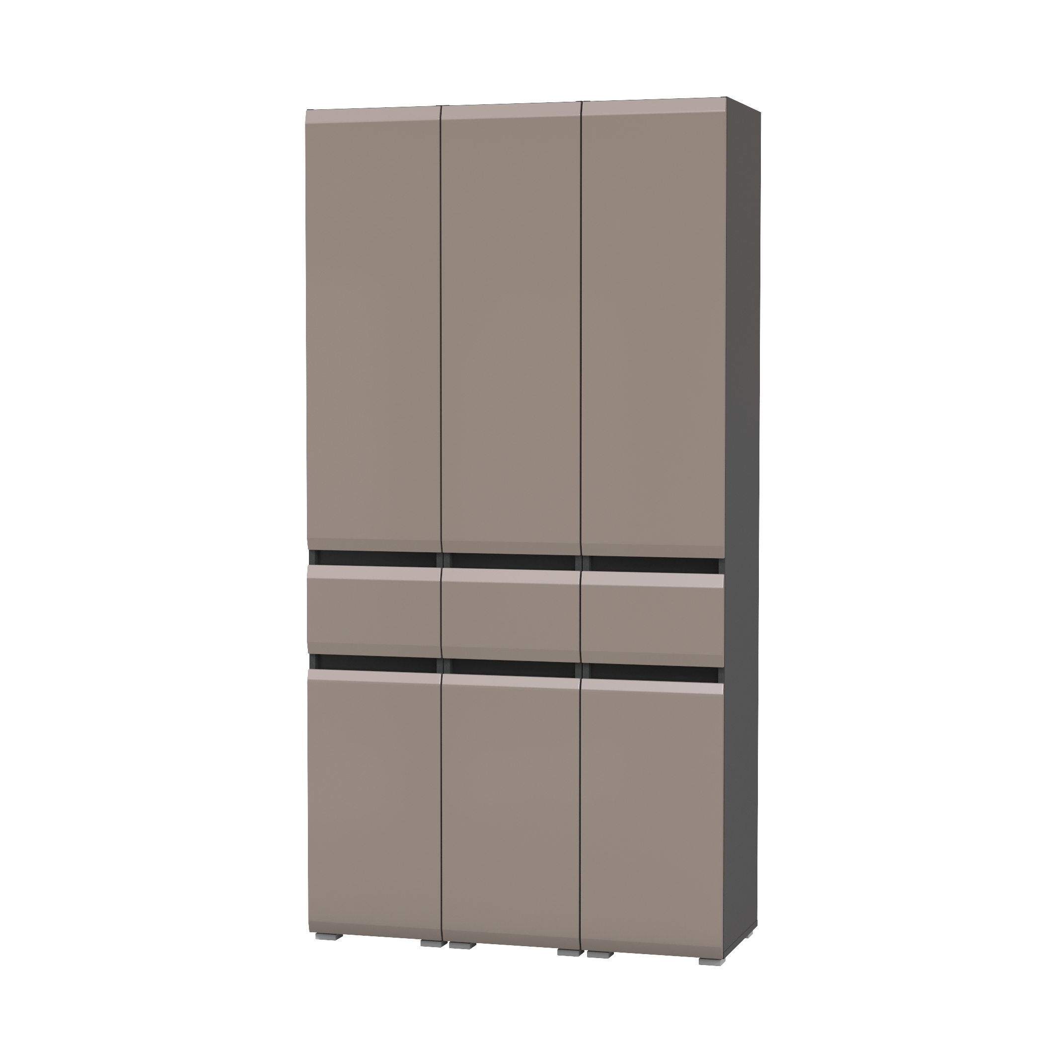 Каждый узкий шкаф Сидней 13.202 (в комплектации 3 единицы) состоит из верхнего и нижнего отделений с полками за дверкой и выдвижным ящиком по центру на шариковых направляющих. В верхнем отделении три полки, в нижней 1 полочка. Чёрная задняя стенка эффектно подчеркивает наполнение шкафов.