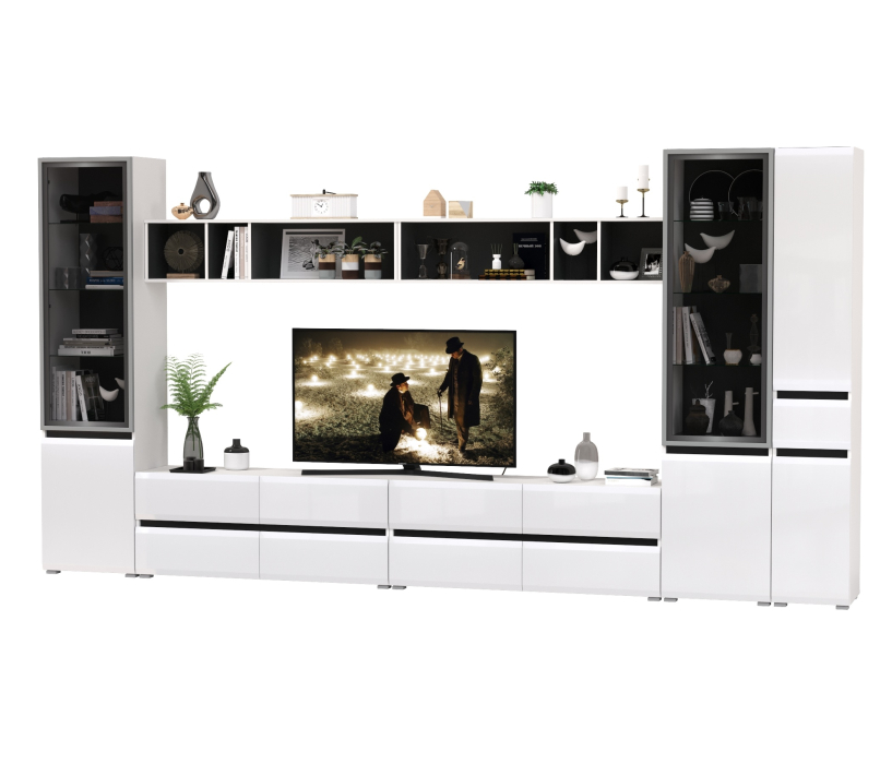 Комплектация состоит из двух тумб под ТВ Сидней 13.63, двух полок Сидней 15.57, двух шкафов с фасадами стекло Сидней 13.201 и узкого шкафа с ящиком Сидней 13.202.