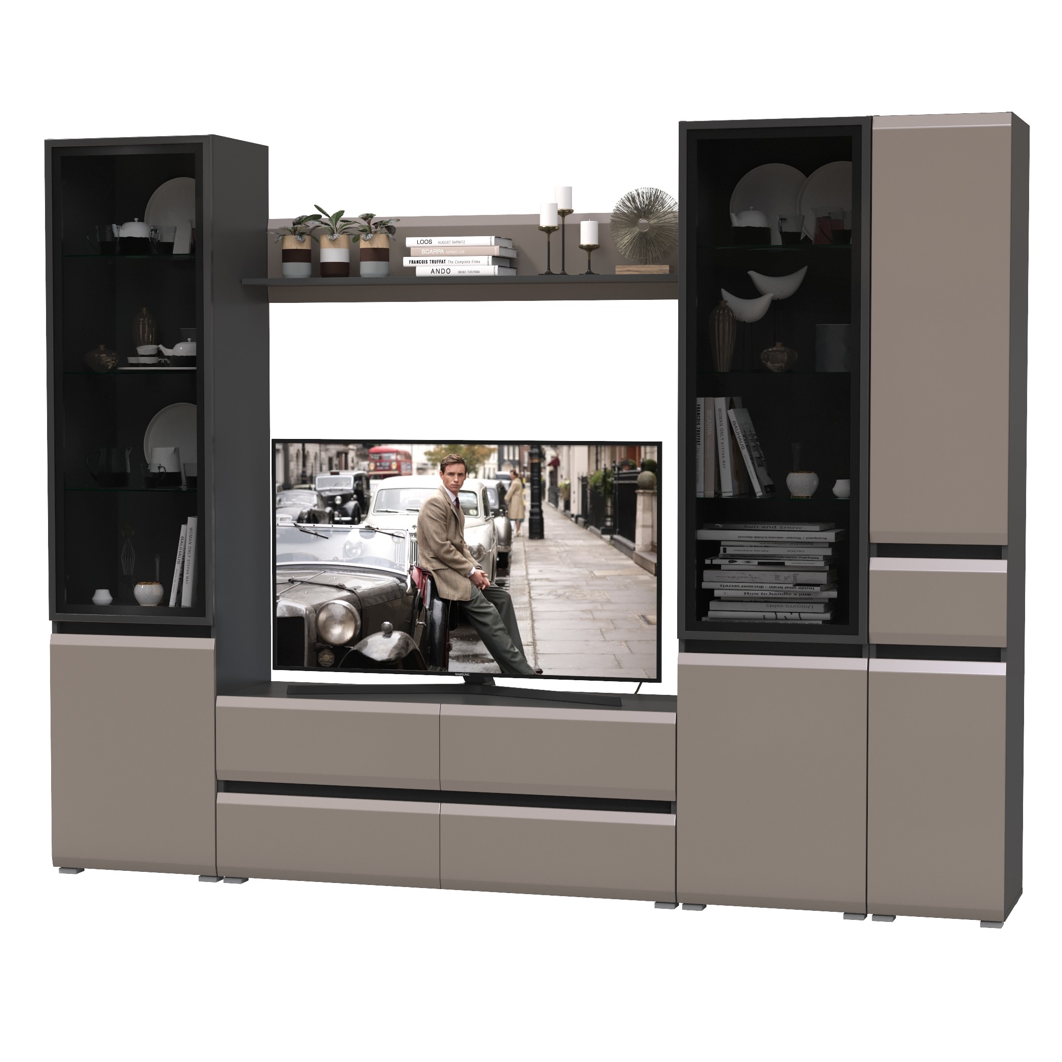 Комплектация состоит из тумбы под ТВ Сидней 13.63, полки открытой Сидней 16.486, двух шкафов с фасадами стекло Сидней 13.201 и узкого шкафа с ящиком Сидней 13.202.