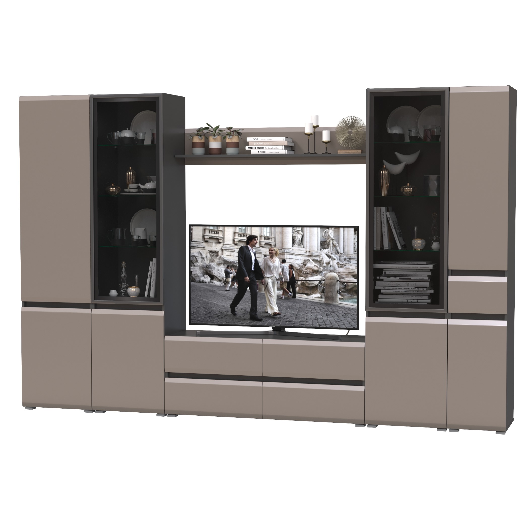 Комплектация состоит из тумбы под ТВ Сидней 13.63, полки открытой Сидней 16.486, шкафа с дверками Сидней 13.200, двух шкафов с фасадами стекло Сидней 13.201 и узкого шкафа с ящиком Сидней 13.202.