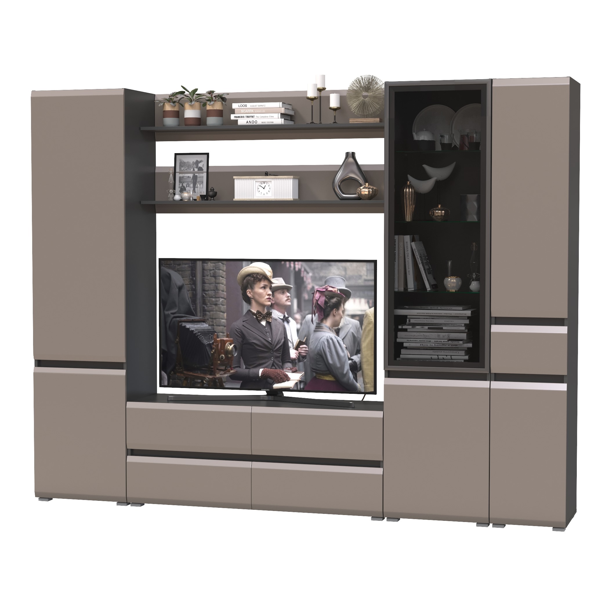 Комплектация состоит из тумбы под ТВ Сидней 13.63, двух полок открытых Сидней 16.486, шкафа с дверками Сидней 13.200, шкафа с фасадами стекло Сидней 13.201 и узкого шкафа с ящиком Сидней 13.202.