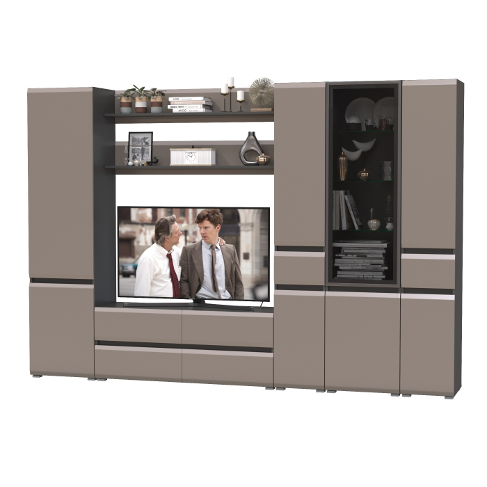 Комплектация состоит из тумбы под ТВ Сидней 13.63, двух полок открытых Сидней 16.486, шкафа с дверками Сидней 13.200, шкафа с фасадами стекло Сидней 13.201 и двух узких шкафов с ящиком Сидней 13.202.