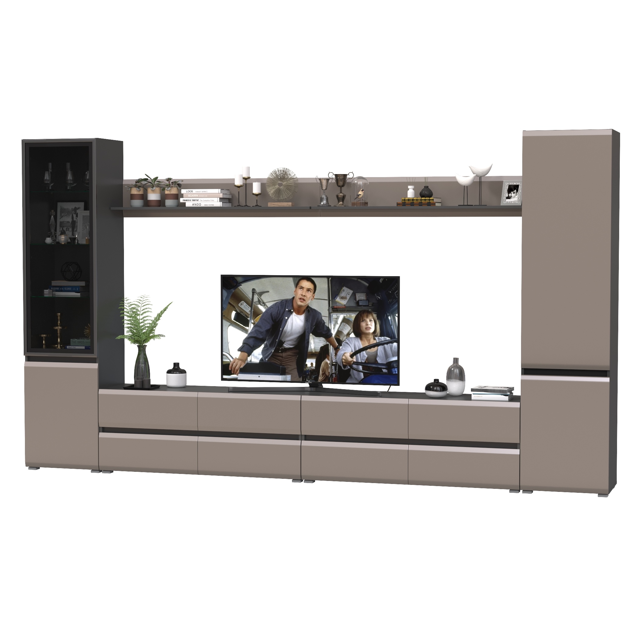 Комплектация состоит из двух тумб под ТВ Сидней 13.63, двух полок открытых Сидней 16.486, шкафа с дверками Сидней 13.200 и шкафа с фасадами стекло Сидней 13.201.