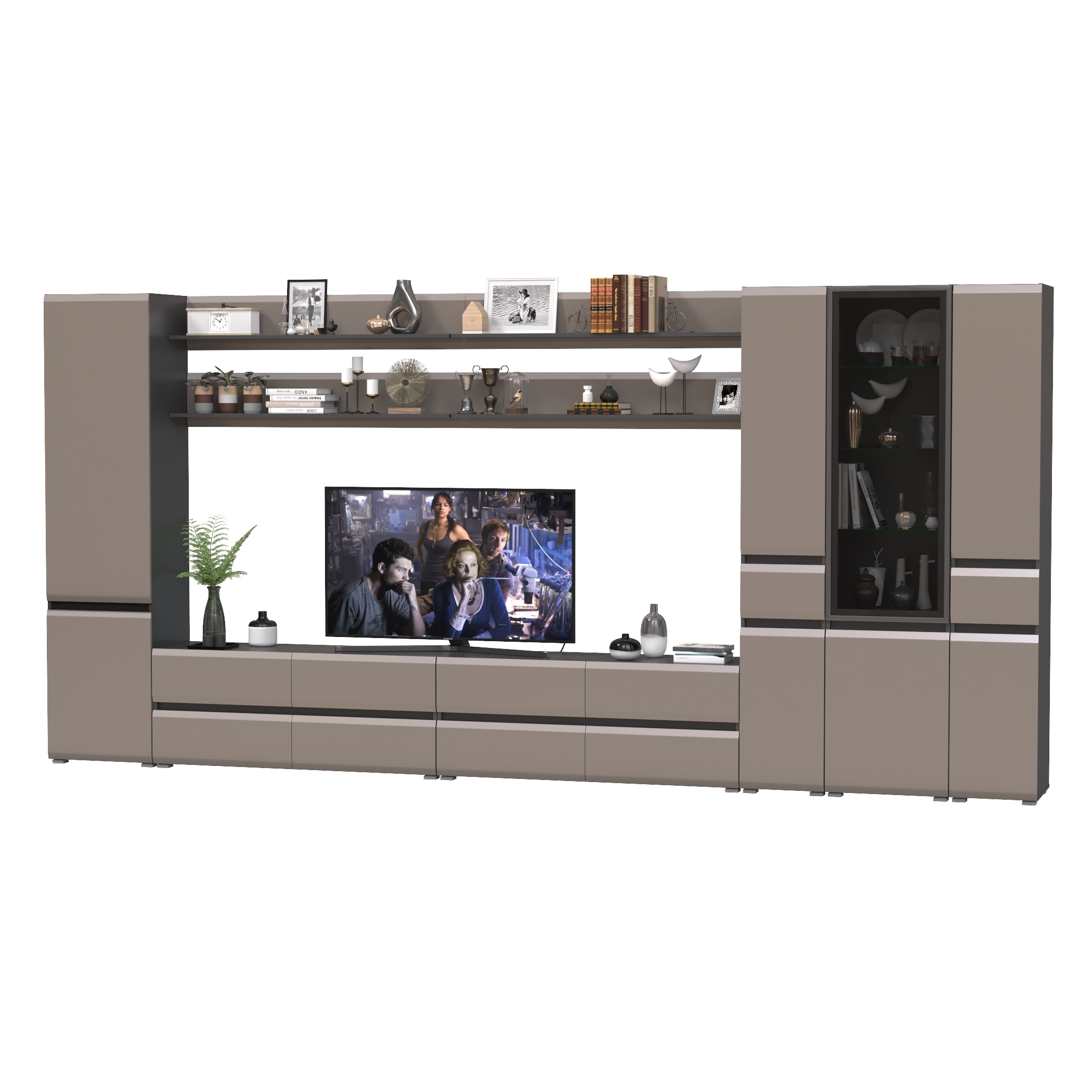 Комплектация состоит из двух тумб под ТВ Сидней 13.63, четырех полок открытых Сидней 16.486, шкафа с дверками Сидней 13.200, шкафа с фасадами стекло Сидней 13.201 и двух узких шкафов с ящиком Сидней 13.202.