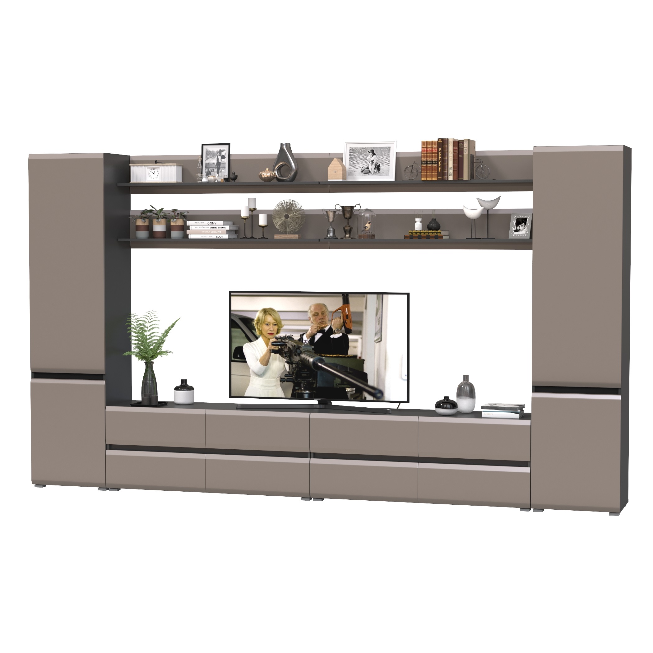 Комплектация состоит из двух тумб под ТВ Сидней 13.63, четырех полок открытых Сидней 16.486 и двух шкафов с дверками Сидней 13.200.