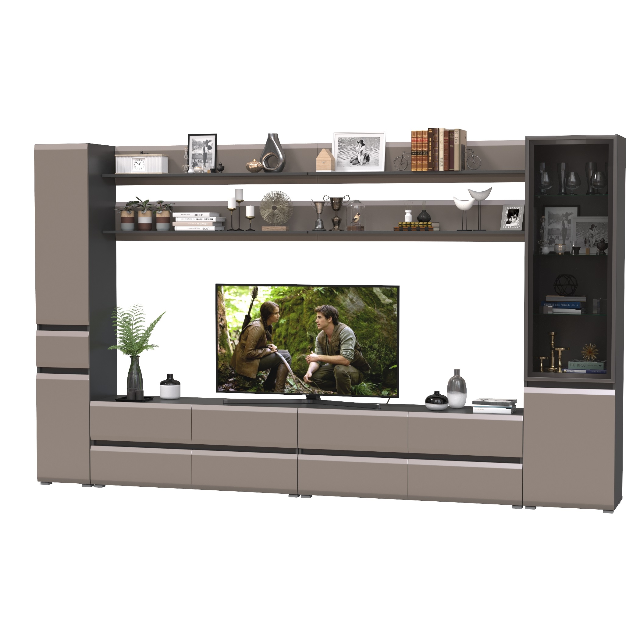Комплектация состоит из двух тумб под ТВ Сидней 13.63, четырех полок открытых Сидней 16.486, шкафа с фасадами стекло Сидней 13.201 и узкого шкафа с ящиком Сидней 13.202.