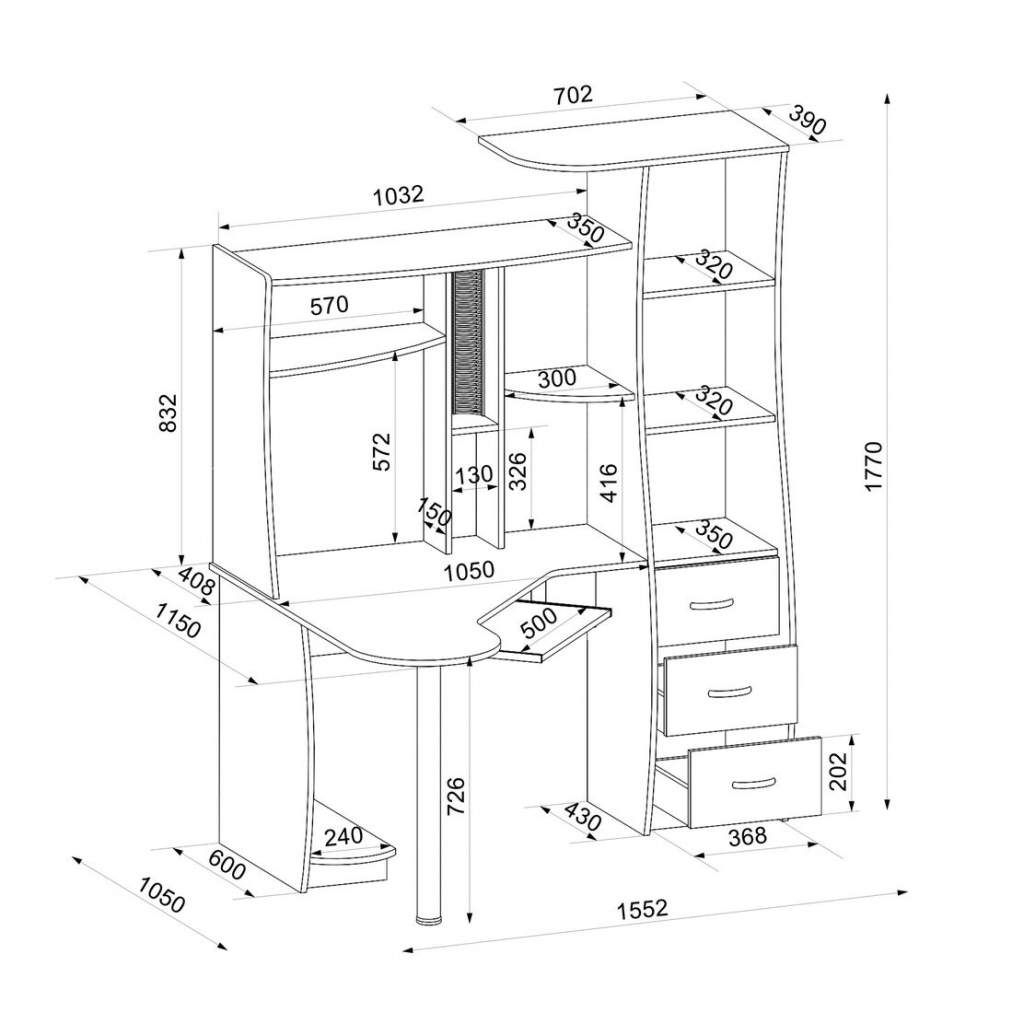 Модель изготовлена из ЛДСП. В изделие применяются надежная, современная фурнитура и качественные, экологически безопасные материалы. Стол оснащен выдвижной полкой под клавиатуру, есть место под системный блок. Модель оборудована различными полками и функциональным стеллажом с тремя выдвижными ящиками. Стол имеет все необходимое для комфортного размещения компьютера, оргтехники и сопутствующих концелярских принадлежностей. Стильный, качественный, современный, угловой компьютерный стол "Шагус-4" будет отличным выбором для создания места для работы, учебы или досуга, поможет с комфортом разместить все ваши вещи, технику и аксессуары и будет радовать вас долгие годы.