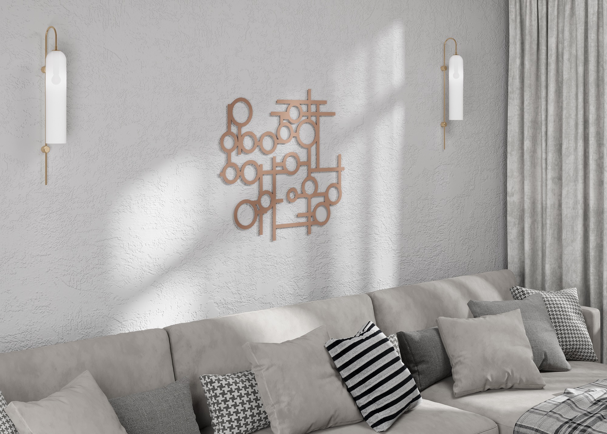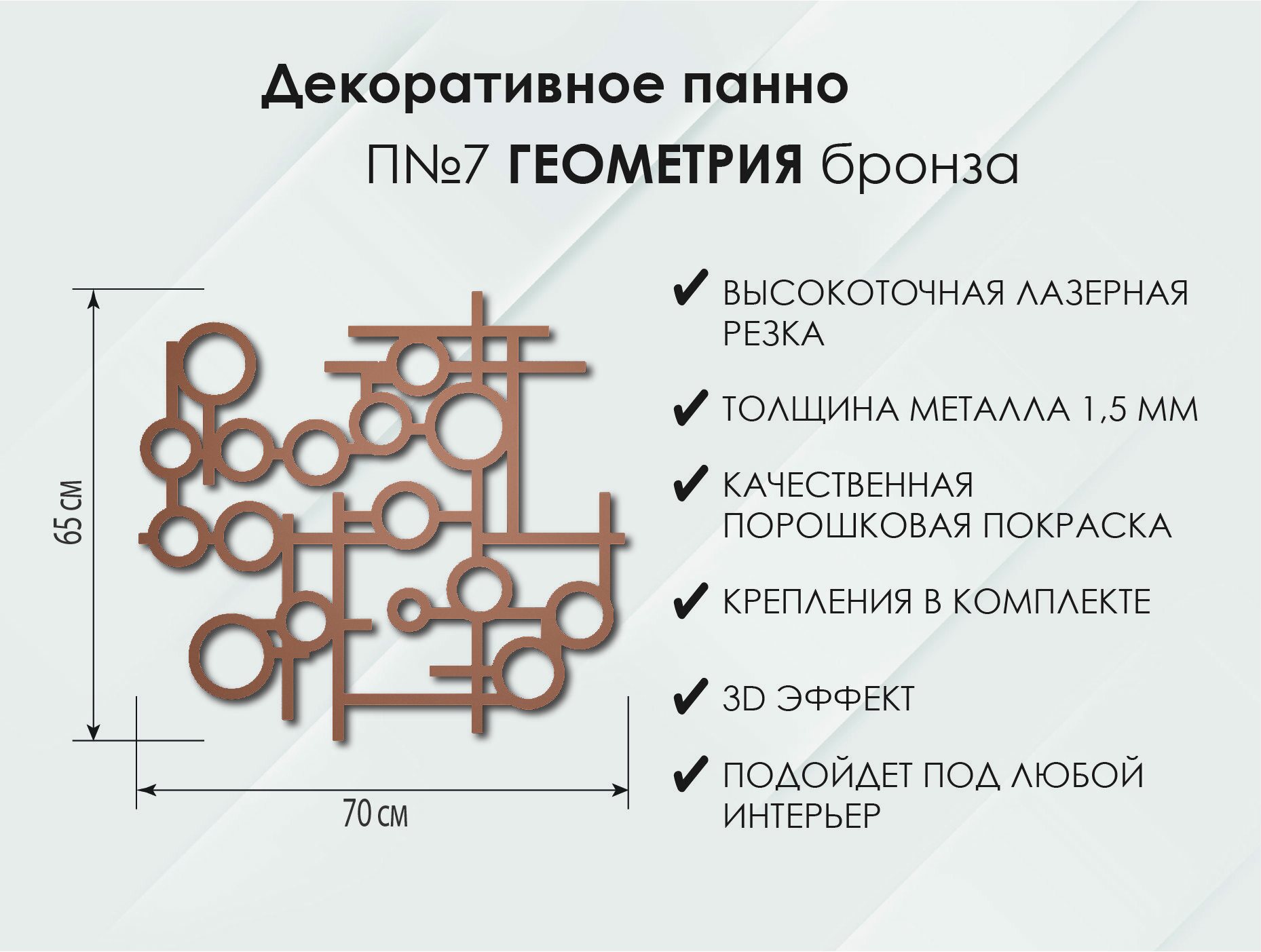 Откройте для себя декоративное панно из надежного металла с толщиной 1,5 мм, выполненное с применением лазерной обработки. Это уникальное изделие представлено в трех элегантных цветах: чёрном, кремово-белом и бронзовом.