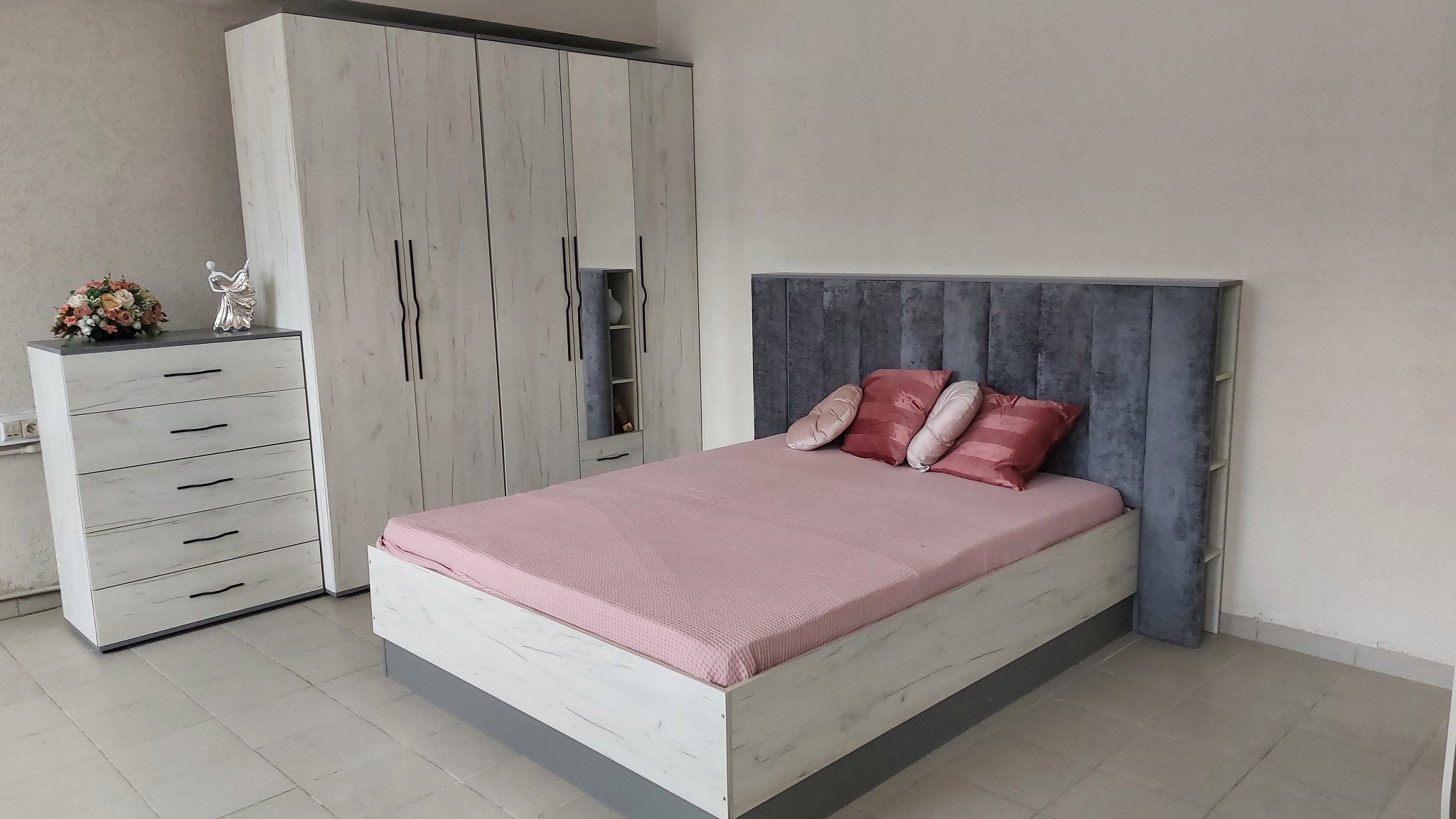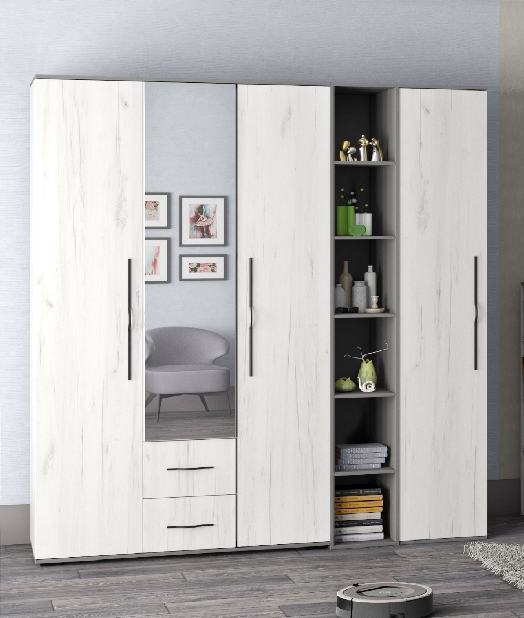Внутри шкаф оснащен антресольной полкой, штангой для вешалок, местом для хранения коробок или обуви и 5-ю полками для одежды и белья.