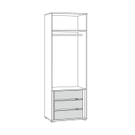 Внутри гардеробная полка, штанга для плечиков и три выдвижных ящика для хранения мелких предметов.