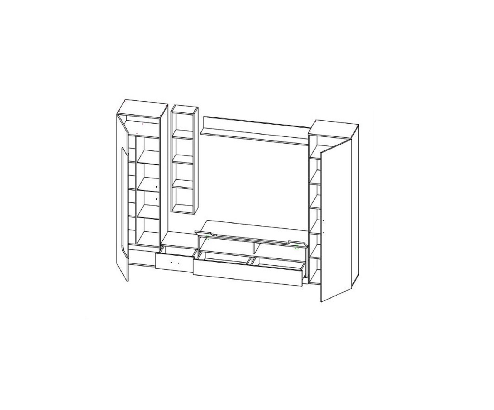 Слева шкаф-витрина, справа шкаф-пенал с полками для хранения, в центре открытые навесные полки и тумба под ТВ с выдвижными ящиками и надстройкой.