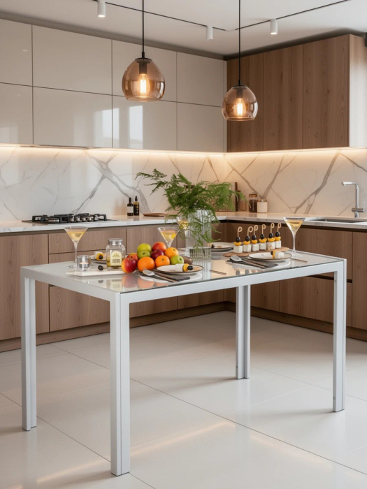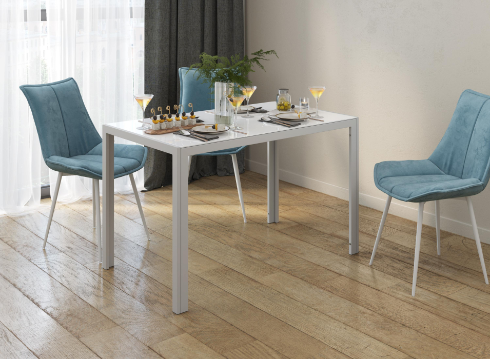 Столешница выполнена из прочного закалённого стекла толщиной 6 мм, что обеспечивает устойчивость к механическим повреждениям и долговечность. Её размеры 120х70 см идеально подходят для семейных обедов или встреч с друзьями. Фиксация столешницы осуществляется с помощью присосок, что обеспечивает её устойчивость и безопасность в использовании. По краям столешница ограничена металлическим профилем, который соединяется с ножками, подчеркивая современный дизайн. Максимальная нагрузка на столешницу составляет 80 кг, что гарантирует его долговечность и удобство для размещения различных предметов, включая посуду и декор.