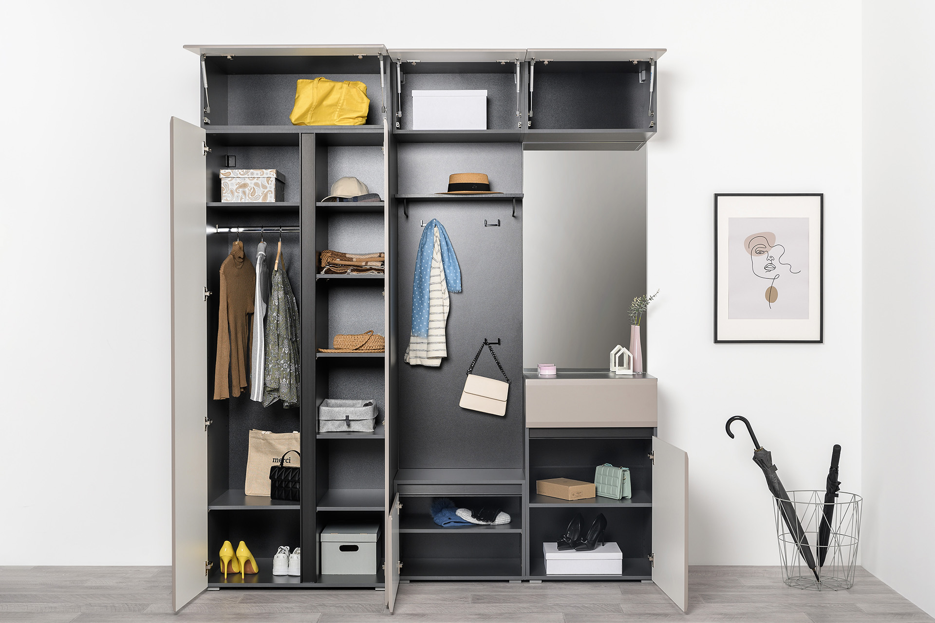 Сидней – стильная и функциональная прихожая, которая масштабируется под любую площадь помещения и высоту потолков. Минималистичные фасады в трендовом цвете без лицевой фурнитуры открываются за край либо нажатием (push-to-open). Большой выбор модулей: высота шкафов от 2050 до 2400 мм и полноразмерная глубина позволит максимально использовать полезное пространство. Вместительная система для хранения одежды, обуви и хозяйственных принадлежностей. Цветовое решение: ЛМДФ 16 мм Веллюто Капучино; ЛДСП 16 мм Антрацит.