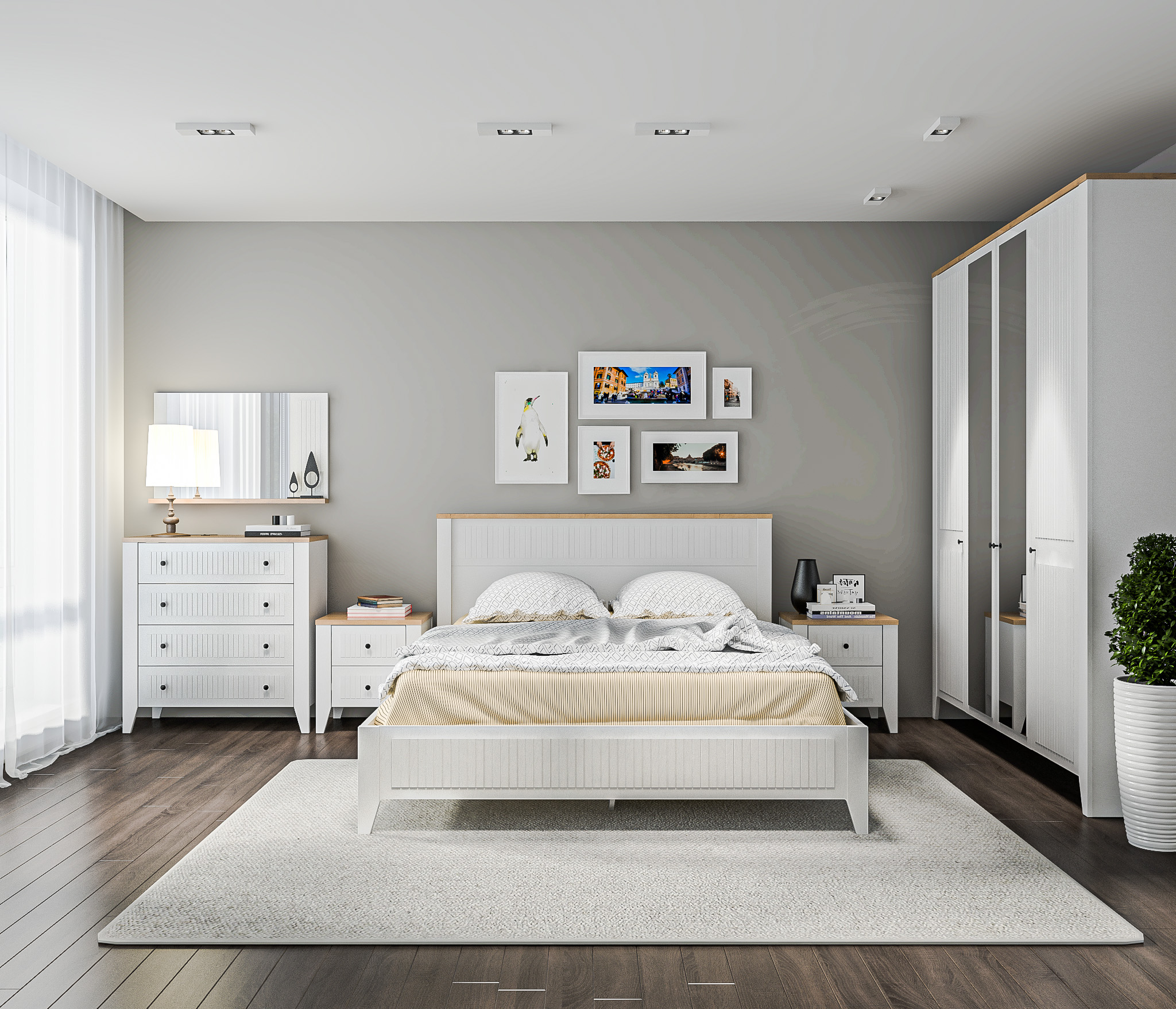 Спальня Монтана с комодом Белый Альпийский,Дуб Гамильтон/МДФ Дуб Белый (Белый Альпийский,Дуб Гамильтон) Код 00000335357