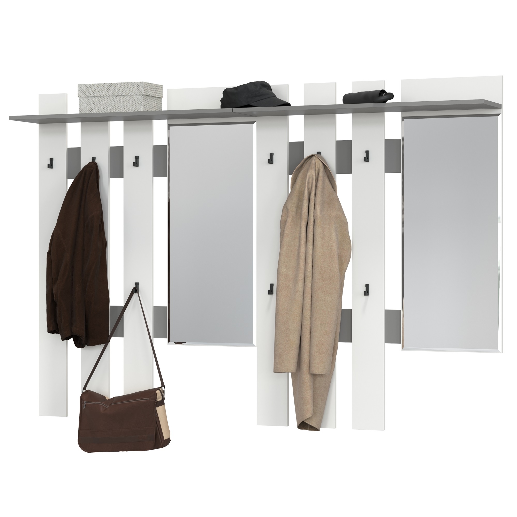 В комплект входят две стильные вешалки с зеркалами, которые не только украсят ваш интерьер, но и обеспечат удобное хранение верхней одежды. В комплекте две вешалки, каждая оборудована шестью дизайнерскими крючками в стиле минимализм, антресольной полкой для головных уборов и зеркалом. Продуманная форма крючков позволяет надёжно удерживать предметы одежды. Большое зеркало, украшенное фацетом, позволит довести Ваш облик до совершенства, придаст уверенности.