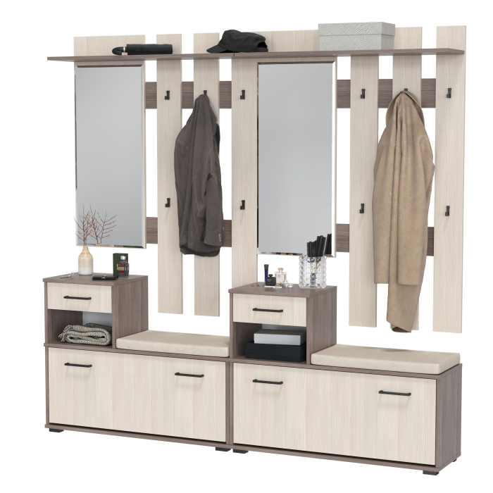 Комплект состоит из двух продуманных гарнитуров, включающих тумбу под обувь и вешалку с зеркалом.