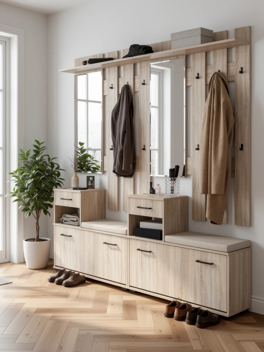 С этими элегантными и функциональными мебельными решениями ваша прихожая станет красивой, опрятной, удобной и современной. Каждый элемент набора тщательно продуман, чтобы создавать комфорт и поддерживать порядок. Тумбы под обувь решают множество задач - сохраняют обувь в чистоте, учат детей аккуратности и дополняют интерьер. Мягкое сидение тумбы обеспечивает удобство при обувании, выдвижной ящик позволяет быстро найти ключницу, а вместительное отделение за откидной дверцей рассчитано на восемь пар обуви, что идеально подходит для семьи. Фасады тумб украшены лаконичными ручками минималистичного дизайна, которые удобны в использовании. Вешалки с зеркалом обеспечивают удобное хранение сезонной одежды. Оснащённые шестью стильными крючками и антресольной полкой для головных уборов, они идеально подходят для организации пространства. Зеркала с фацетом украсят интерьер и помогут завершить образ перед выходом. Две прихожие в комплекте предоставляют больше возможностей для хранения, создания стильного интерьера и организации порядка в доме.
