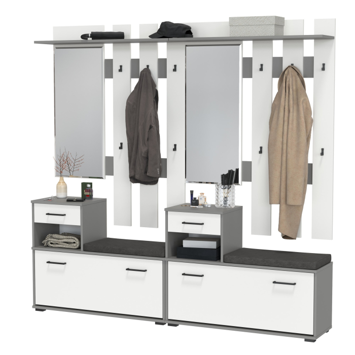 Комплект состоит из двух продуманных гарнитуров, включающих тумбу под обувь и вешалку с зеркалом.