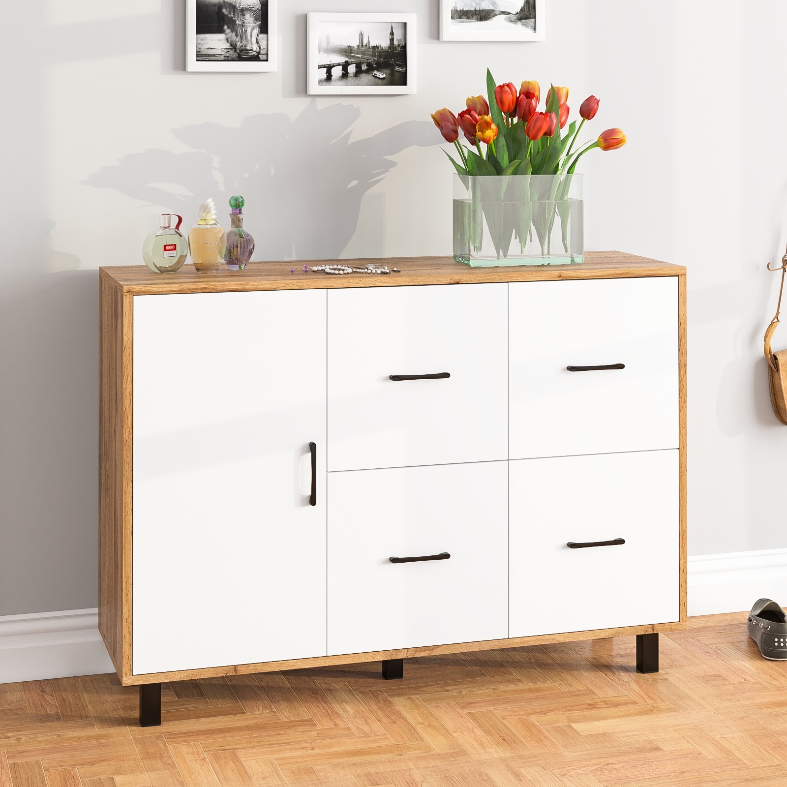 Комод оснащен просторным и продуманным функционалом. Слева находится распашная дверца (732х386 мм), за которой предусмотрена полка для аккуратного размещения вещей. Справа расположены четыре одинаковых выдвижных ящика, организованных в два ряда. Размер фасадов ящиков составляет 365х386 мм, что обеспечивает достаточную вместимость. Все ящики оборудованы шариковыми направляющими длиной 350 мм, что обеспечивает плавное и тихое выдвижение. Обратите внимание, что комод-тумба не имеет универсальной сборки - дверца расположена только слева, а ящики – справа. Комод установлен на черные металлические опоры высотой 100 мм, придающие конструкции устойчивость и современный внешний вид. Для удобства открывания двери и ящиков используются стильные металлические ручки длиной 128 мм черного цвета, которые гармонично дополняют общий дизайн.