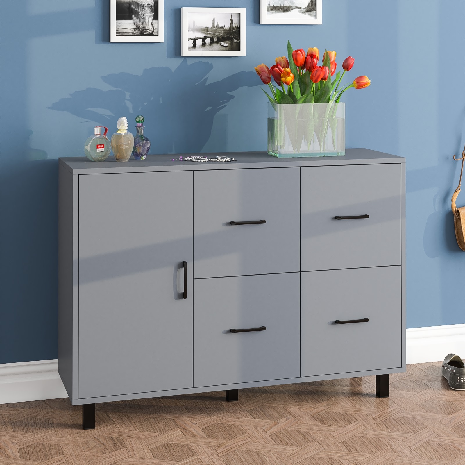 Комод оснащен просторным и продуманным функционалом. Слева находится распашная дверца (732х386 мм), за которой предусмотрена полка для аккуратного размещения вещей. Справа расположены четыре одинаковых выдвижных ящика, организованных в два ряда. Размер фасадов ящиков составляет 365х386 мм, что обеспечивает достаточную вместимость. Все ящики оборудованы шариковыми направляющими длиной 350 мм, что обеспечивает плавное и тихое выдвижение. Обратите внимание, что комод-тумба не имеет универсальной сборки - дверца расположена только слева, а ящики – справа. Комод установлен на черные металлические опоры высотой 100 мм, придающие конструкции устойчивость и современный внешний вид. Для удобства открывания двери и ящиков используются стильные металлические ручки длиной 128 мм черного цвета, которые гармонично дополняют общий дизайн.