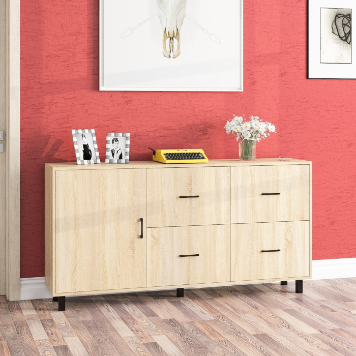 Комод оснащен просторным и продуманным функционалом. Слева находится распашная дверца (732х553 мм), за которой предусмотрена полка для аккуратного размещения вещей. Справа расположены четыре одинаковых выдвижных ящика, организованных в два ряда. Размер фасадов ящиков составляет 365х553 мм, что обеспечивает достаточную вместимость. Все ящики оборудованы шариковыми направляющими длиной 350 мм, что обеспечивает плавное и тихое выдвижение. Обратите внимание, что комод-тумба не имеет универсальной сборки - дверца расположена только слева, а ящики – справа. Комод установлен на черные металлические опоры высотой 100 мм, придающие конструкции устойчивость и современный внешний вид. Для удобства открывания двери и ящиков используются стильные металлические ручки длиной 128 мм черного цвета, которые гармонично дополняют общий дизайн.