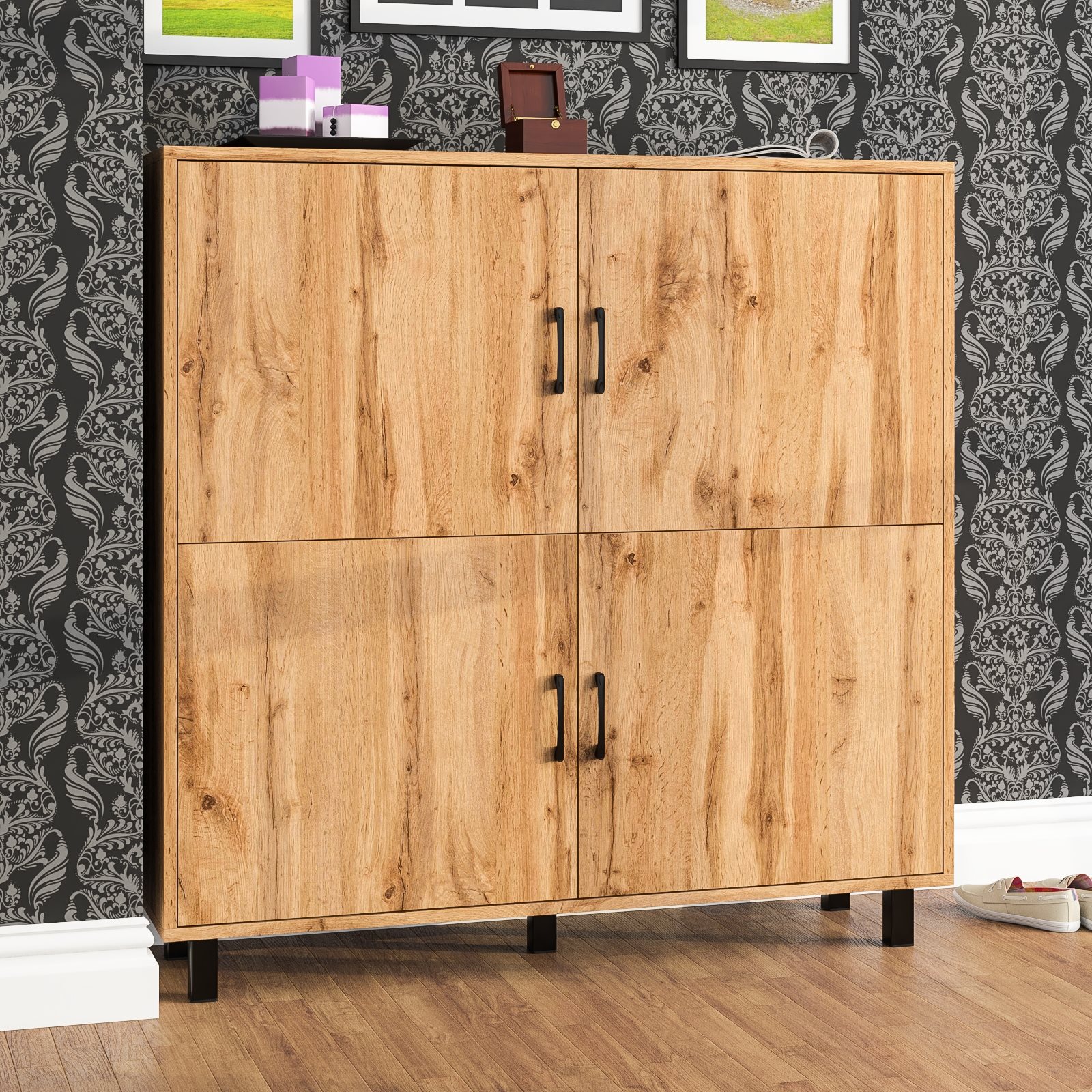 Тумба оборудована четырьмя распашными дверками, расположенными в два ряда по две – верхний и нижний. Размеры каждой створки составляют 530х580 мм, что обеспечивает удобство хранения и комфортный доступ к содержимому. За каждой парой дверок расположено отделение с полкой по центру, что позволяет эффективно организовать внутреннее пространство и хранить вещи в порядке. Тумба установлена на пять устойчивых металлических опор черного цвета высотой 100 мм, что придает конструкции современный вид и легкость. Для удобства использования створки открываются с помощью стильных металлических ручек длиной 128 мм, выполненных в минималистичном черном цвете.