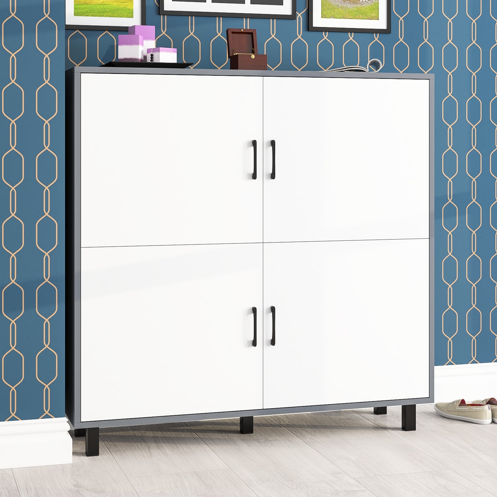 Тумба оборудована четырьмя распашными дверками, расположенными в два ряда по две – верхний и нижний. Размеры каждой створки составляют 530х580 мм, что обеспечивает удобство хранения и комфортный доступ к содержимому. За каждой парой дверок расположено отделение с полкой по центру, что позволяет эффективно организовать внутреннее пространство и хранить вещи в порядке. Тумба установлена на пять устойчивых металлических опор черного цвета высотой 100 мм, что придает конструкции современный вид и легкость. Для удобства использования створки открываются с помощью стильных металлических ручек длиной 128 мм, выполненных в минималистичном черном цвете.