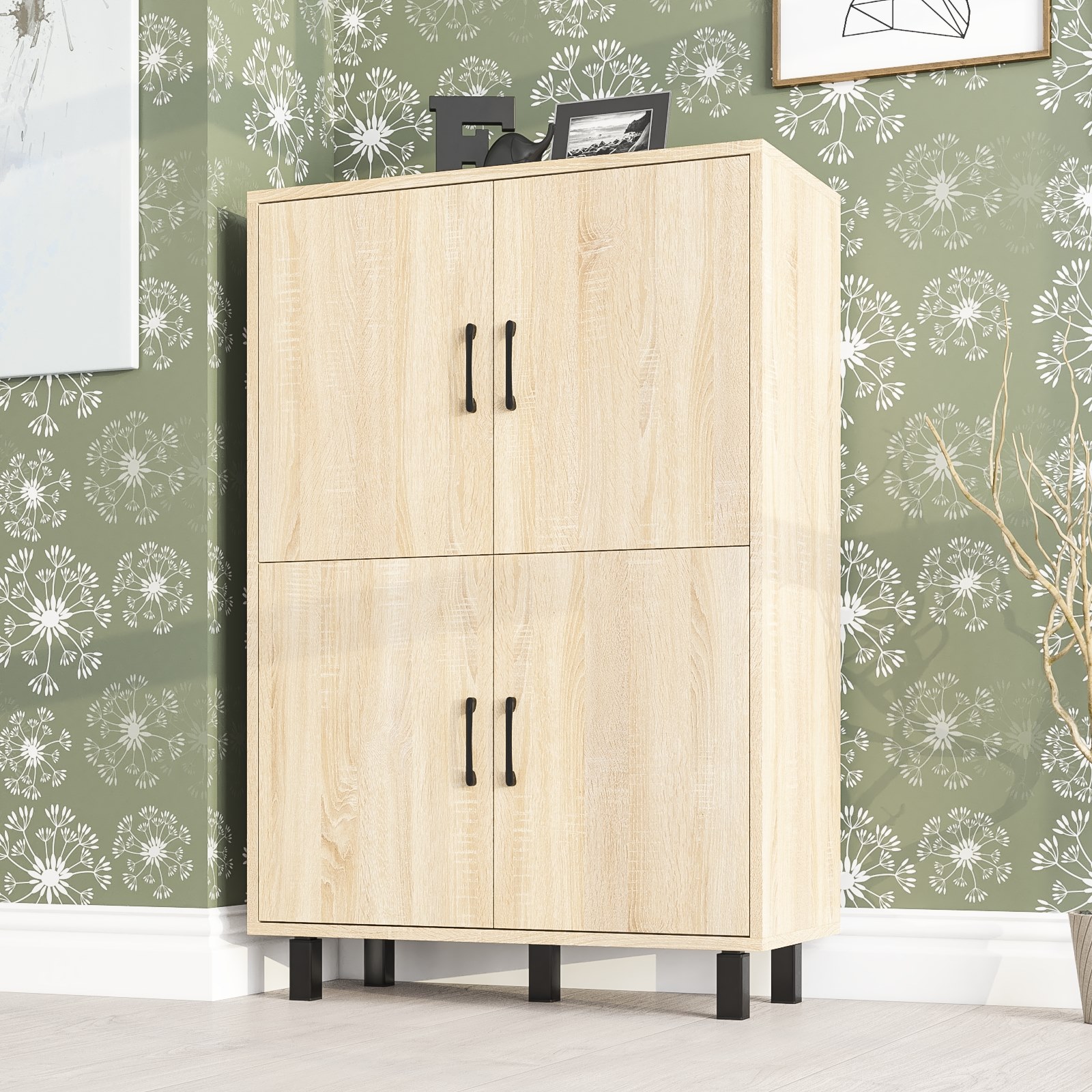 Тумба оборудована четырьмя распашными дверками, расположенными в два ряда по две – верхний и нижний. Размеры каждой створки составляют 530х380 мм, что обеспечивает удобство хранения и комфортный доступ к содержимому. За каждой парой дверок расположено отделение с полкой по центру, что позволяет эффективно организовать внутреннее пространство и хранить вещи в порядке. Тумба установлена на пять устойчивых металлических опор черного цвета высотой 100 мм, что придает конструкции современный вид и легкость. Для удобства использования створки открываются с помощью стильных металлических ручек длиной 128 мм, выполненных в минималистичном черном цвете.