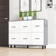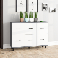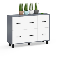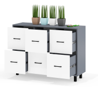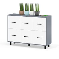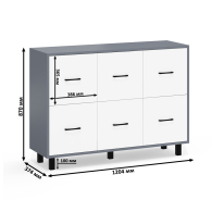 Комод оборудован шестью одинаковыми выдвижными ящиками, расположенными в два ряда по три – три сверху и три снизу. Размер фасадов ящиков составляет 365х386 мм, что позволяет хранить большое количество вещей, поддерживая порядок. Каждый ящик оснащен шариковыми направляющими длиной 350 мм, обеспечивающими плавное и бесшумное выдвижение. Конструкция комода установлена на пять металлических опор черного цвета высотой 100 мм, что придает изделию устойчивость и стильный внешний вид. Для удобства использования предусмотрены металлические ручки длиной 128 мм черного цвета, которые добавляют завершенности современному дизайну.
