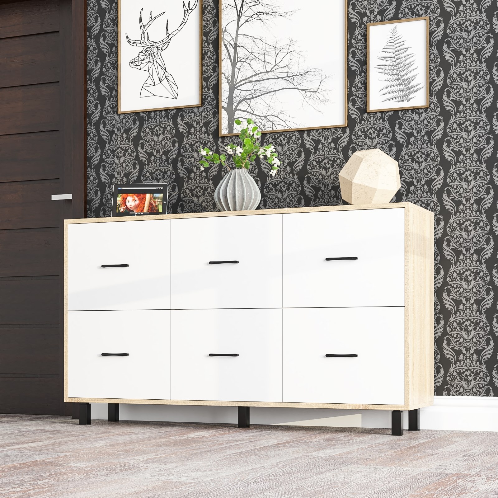 Комод оборудован шестью одинаковыми выдвижными ящиками, расположенными в два ряда по три – три сверху и три снизу. Размер фасадов ящиков составляет 365х486 мм, что позволяет хранить большое количество вещей, поддерживая порядок. Каждый ящик оснащен шариковыми направляющими длиной 350 мм, обеспечивающими плавное и бесшумное выдвижение. Конструкция комода установлена на пять металлических опор черного цвета высотой 100 мм, что придает изделию устойчивость и стильный внешний вид. Для удобства использования предусмотрены металлические ручки длиной 128 мм черного цвета, которые добавляют завершенности современному дизайну.
