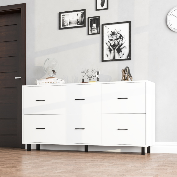 Комод оборудован шестью одинаковыми выдвижными ящиками, расположенными в два ряда по три – три сверху и три снизу. Размер фасадов ящиков составляет 365х552 мм, что позволяет хранить большое количество вещей, поддерживая порядок. Каждый ящик оснащен шариковыми направляющими длиной 350 мм, обеспечивающими плавное и бесшумное выдвижение. Конструкция комода установлена на пять металлических опор черного цвета высотой 100 мм, что придает изделию устойчивость и стильный внешний вид. Для удобства использования предусмотрены металлические ручки длиной 128 мм черного цвета, которые добавляют завершенности современному дизайну.