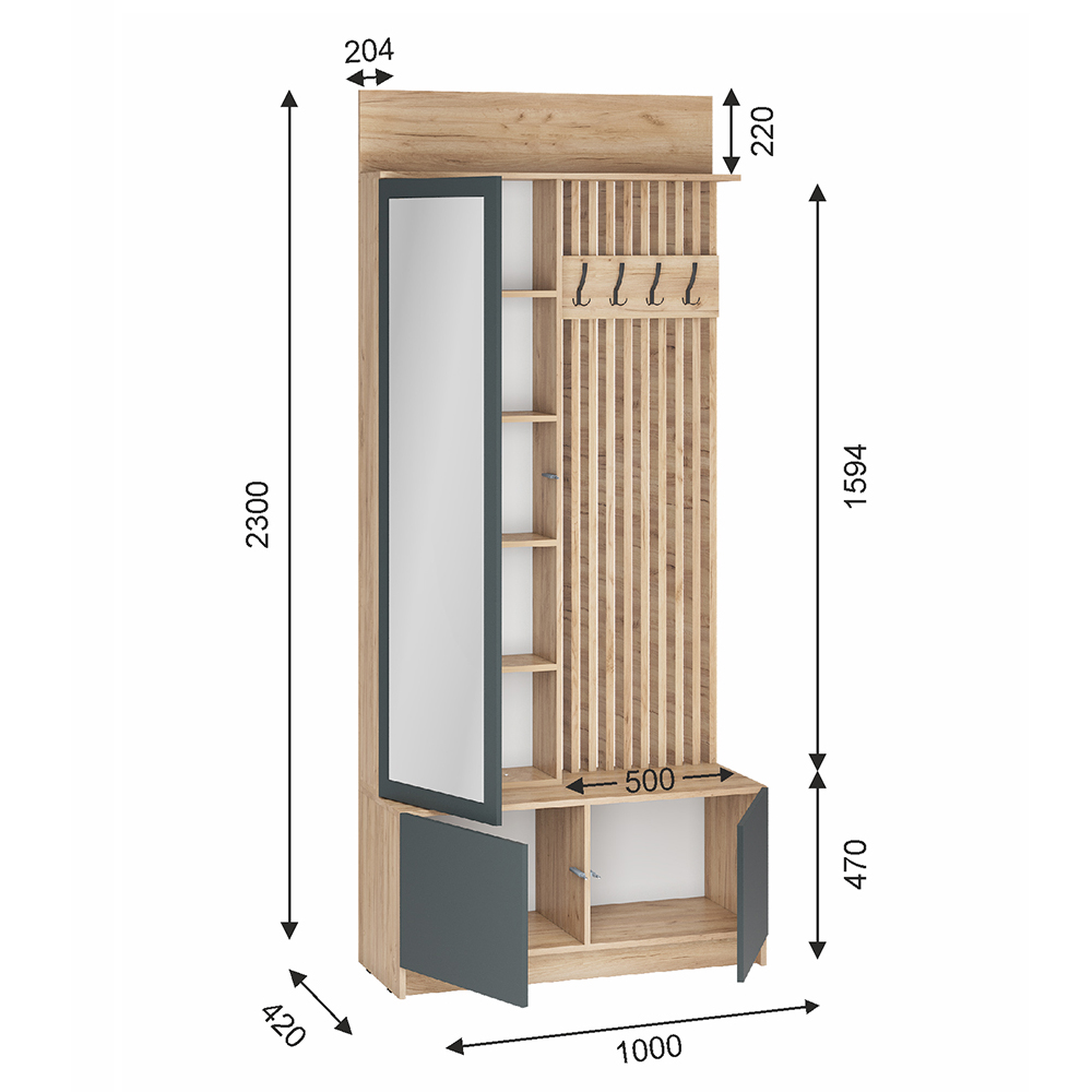 Вешалка Стоуби отлично подойдет для небольших прихожих. Данная модель выполнена в модном цветовом решении корпус: дуб крафт золотой, а фасады вы можете выбрать из двух цветов графит или белый глянец.