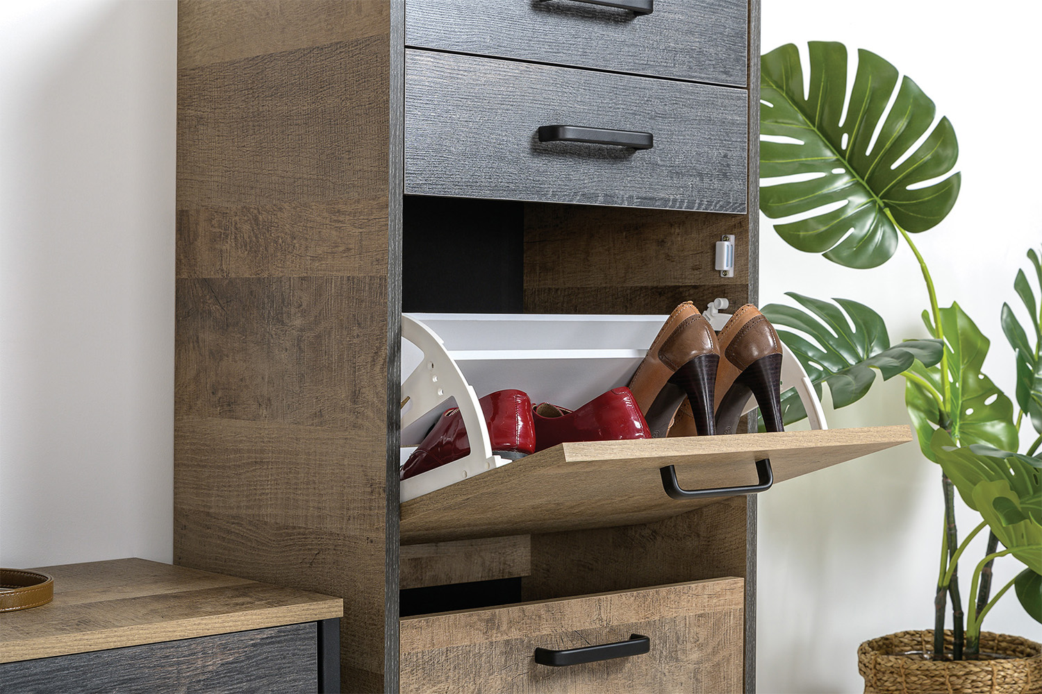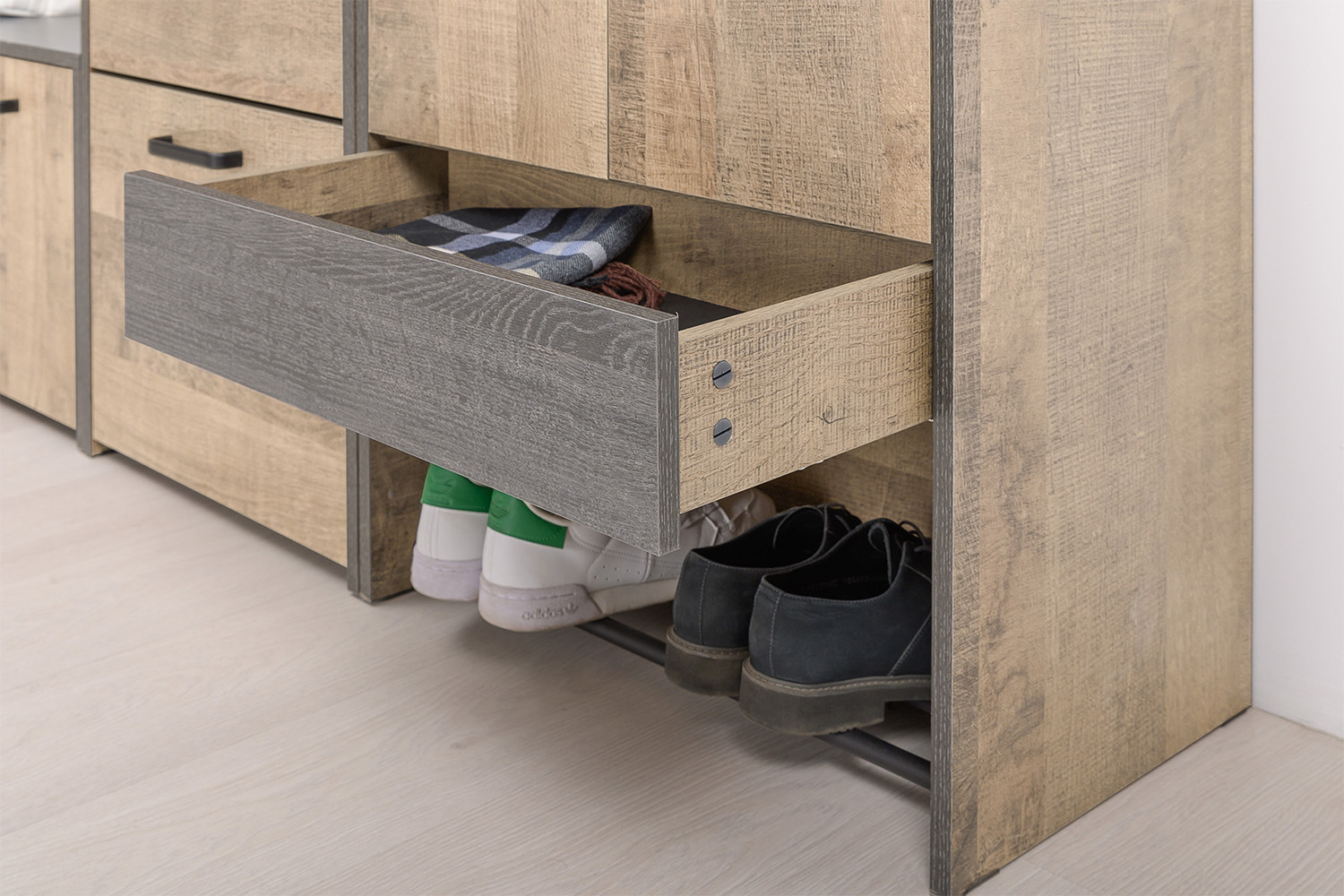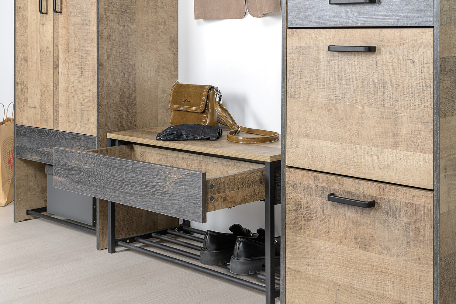 Лицевая фурнитура с тем же покрытием придаёт мебели индустриальную эстетику.