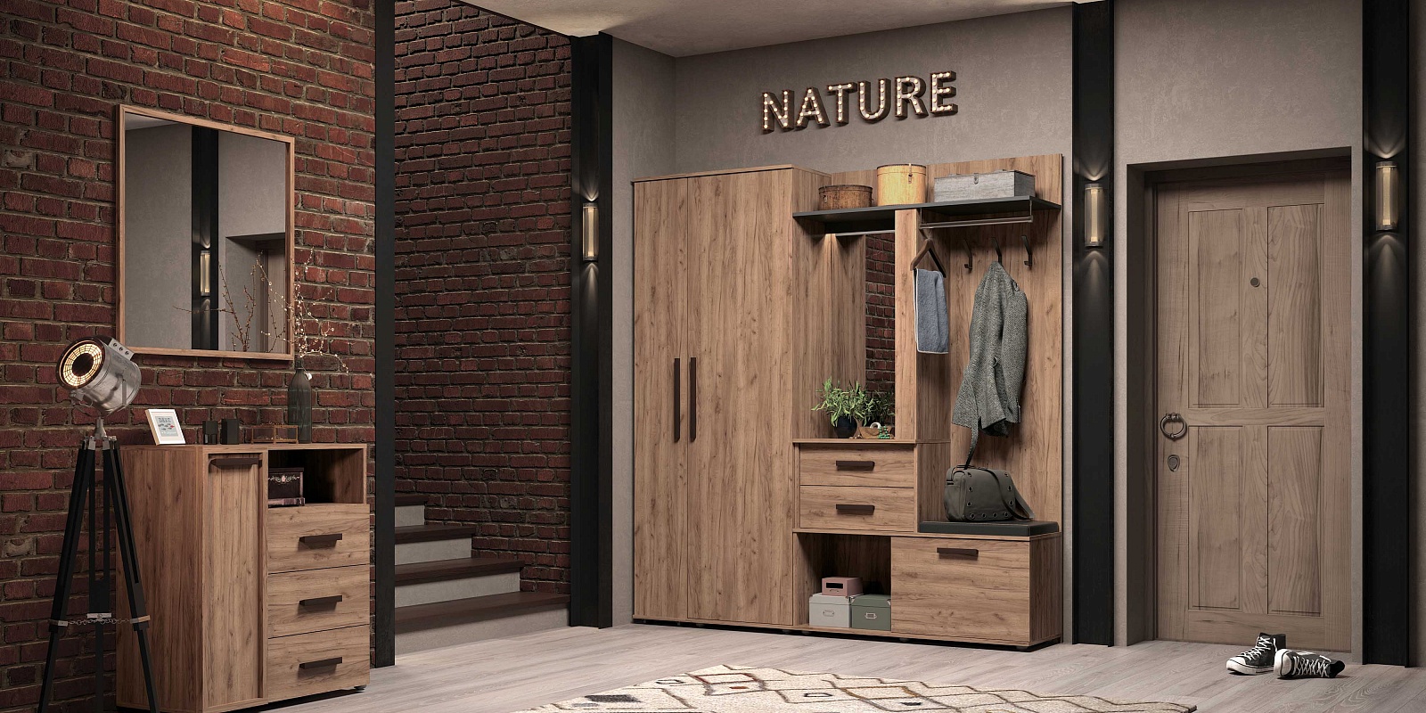 Какой бы не была Ваша прихожая, с мебелью из коллекции Nature Вы сможете обустроить ее рационально и с наименьшими затратами. Современный стиль, материал под натуральное дерево, грубые детали добавят стиля входной зоне Вашей квартиры.