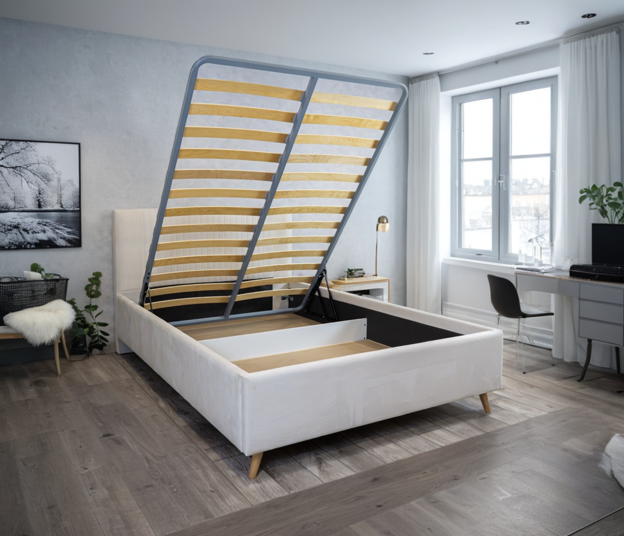 Добротная стильная кровать, есть ящик для белья и подъемный механизм. Ножки достаточно высокие, чтобы проехал робот-пылесос