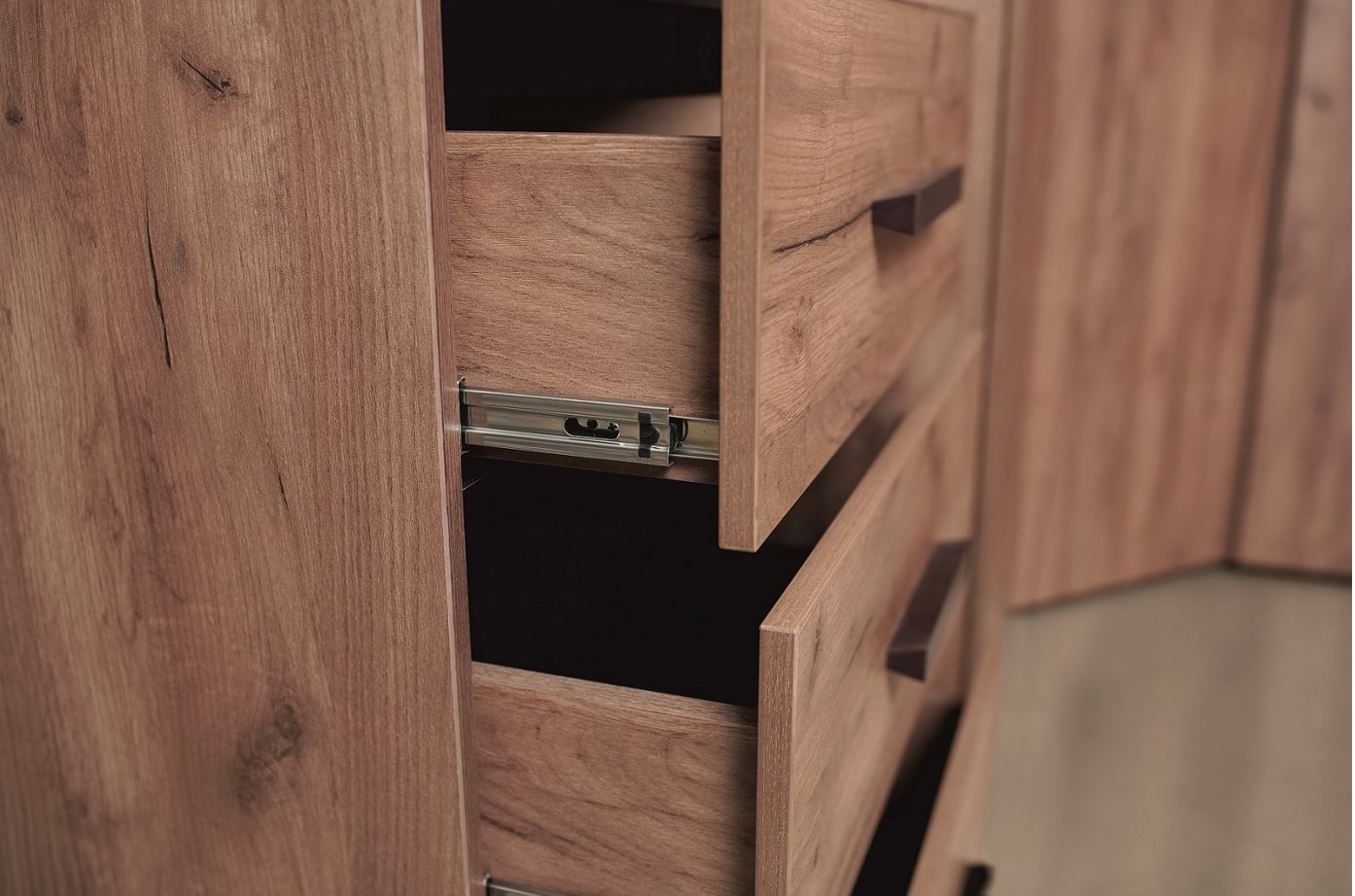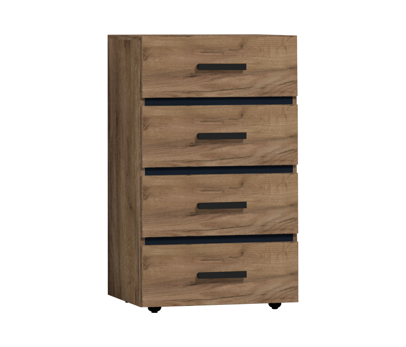 Для спальни отлично подойдет высокий комод Nature 45. Гладкие фасады ящиков в теплом декоре Дуб Табачный Craft с контрастными черными боковыми планками снизу делают его по-настоящему особенным. Четыре выдвижных ящика способны вместить все необходимое, а компактная конструкция сэкономит место в комнате. Ящики легко открываются благодаря направляющим полного выдвижения. Они быстро и легко устанавливаются при сборке комода. Регулируемые опоры компенсируют незначительные неровности пола.