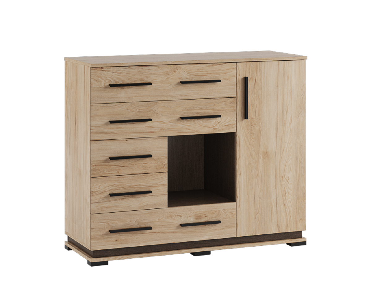 Одним из самых полезных по функционалу модулей в коллекции Модена выступает комод МК-2. Комод имеет столешницу шириной 120 см, на которой Вы с комфортом разместите книги, предметы декора и памятные вещицы. Комплект ящиков пригодится для хранения различных вещей: журналов, небольших коробок, домашней мелочовки. Открытая ниша в центре комода цвета венге пригодится для тех предметов, которые нужно иметь под рукой. Секция за дверцей с полками подарит дополнительное пространство для хранения.