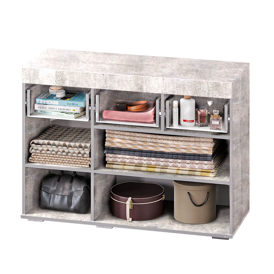 Комод состоит из трёх выдвижных ящиков и четырёх открытых полок, обеспечивая достаточно места для хранения различных предметов. Металлические ручки добавляют шарма и элегантности, а регулируемые опоры позволяют установить комод даже на неровной поверхности.