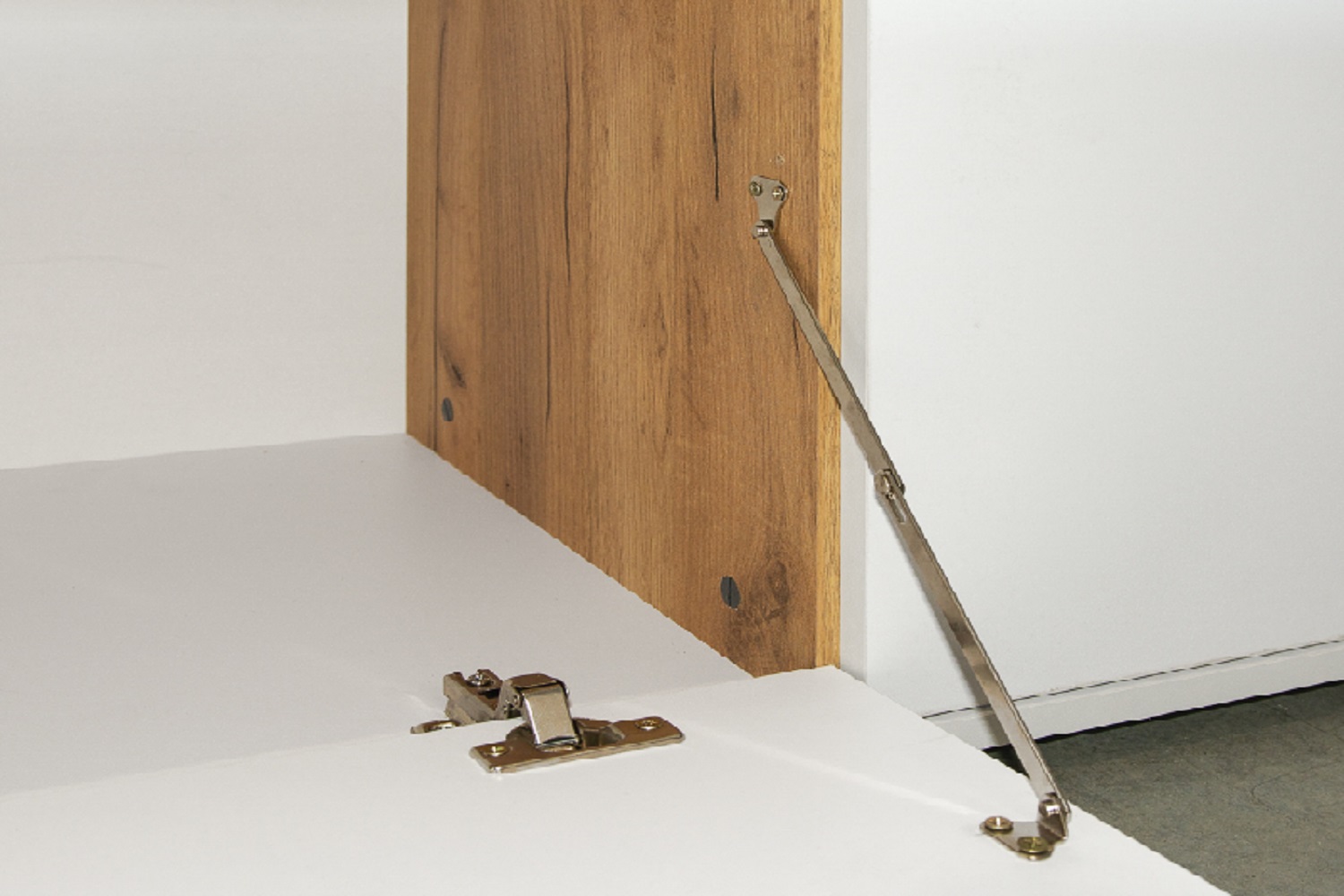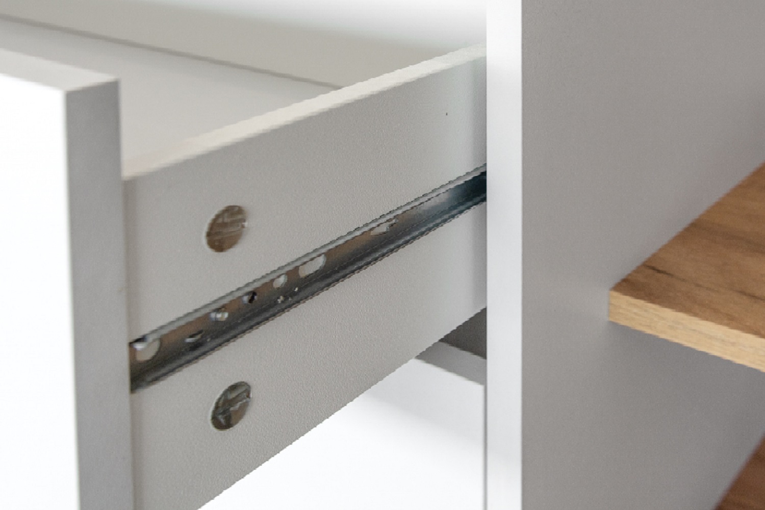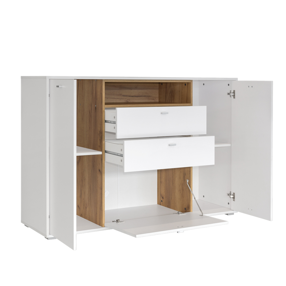 Комод имеет открытую полку, две двери и два выдвижных ящика, которые оснащены шариковыми направляющими и удобными ручками. Благодаря качественным материалам (ЛДСП) и надёжной фурнитуре, комод прослужит вам долгое время.