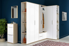 Комод выполнен в двух цветах: дуб сонома и белый премиум, что позволяет подобрать вариант, который будет сочетаться с общим стилем помещения. Корпус и фасад изготовлены из ЛДСП, что обеспечивает прочность и долговечность изделия.