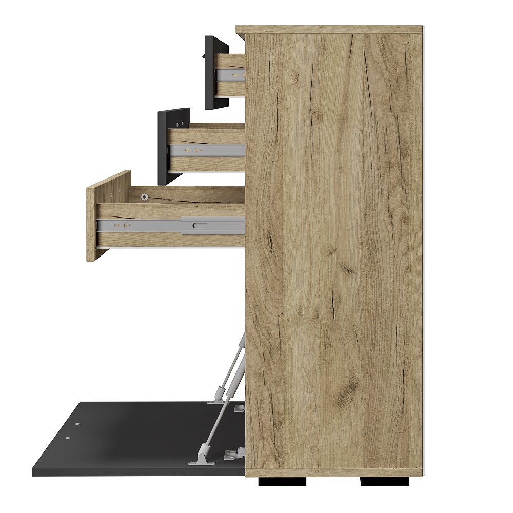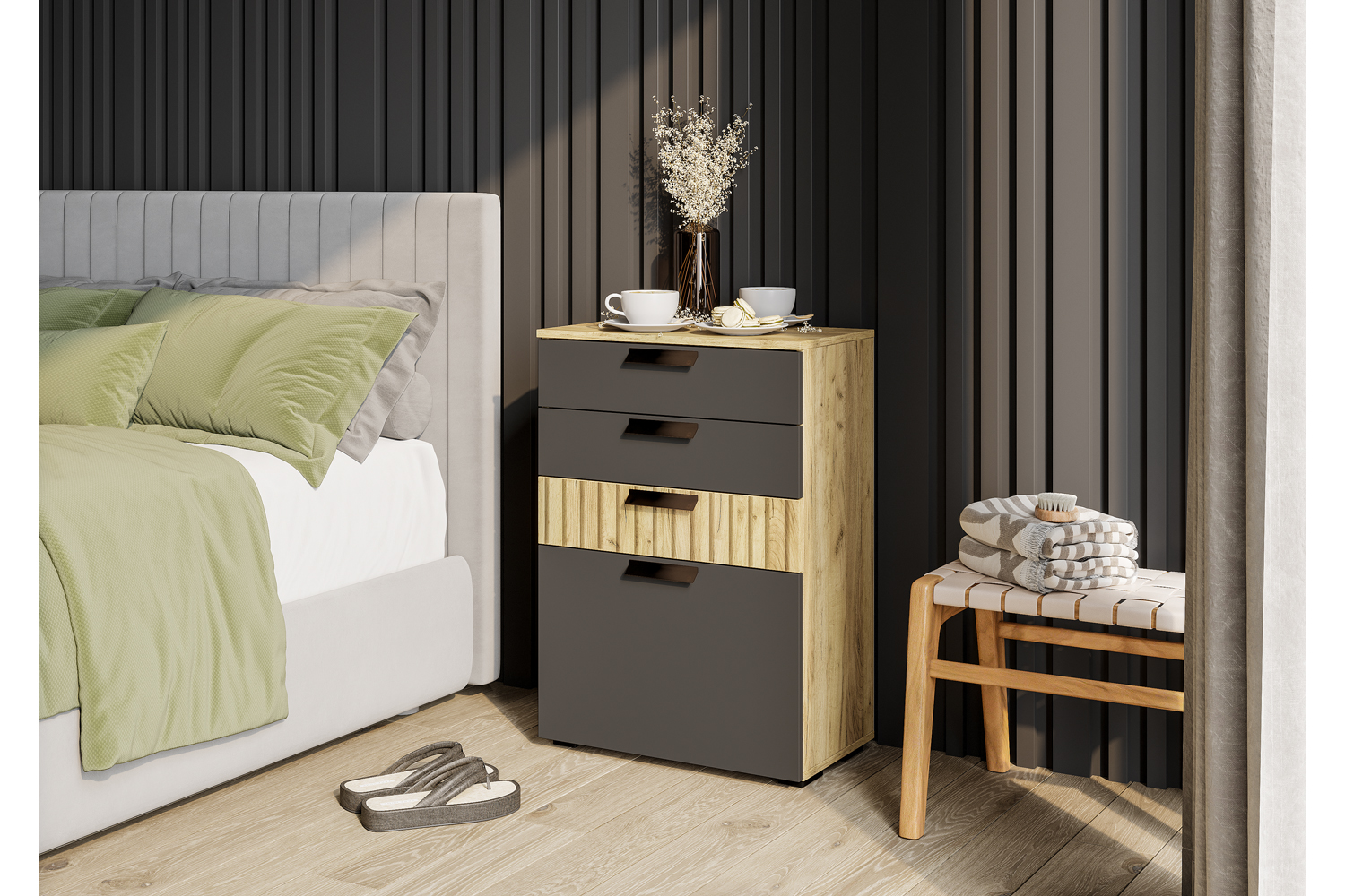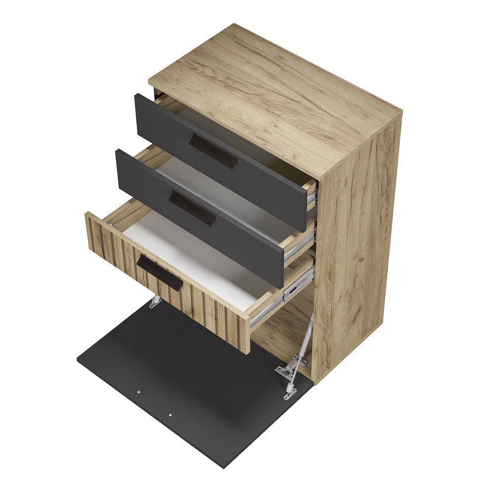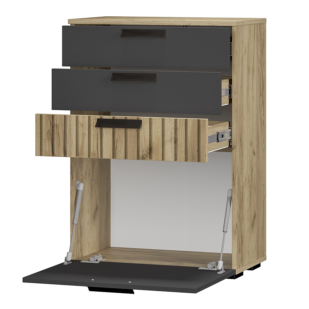Комод Мишель тип 1 КМ-12 — это стильный и функциональный элемент мебели для гостиной. Фасад комода выполнен в глубоком оттенке графит, который контрастирует с холодными цветами стен. Корпус и поверхности выполнены в цвете крафт, что создаёт гармоничное сочетание с фотопечатью, имитирующей деревянные рейки.