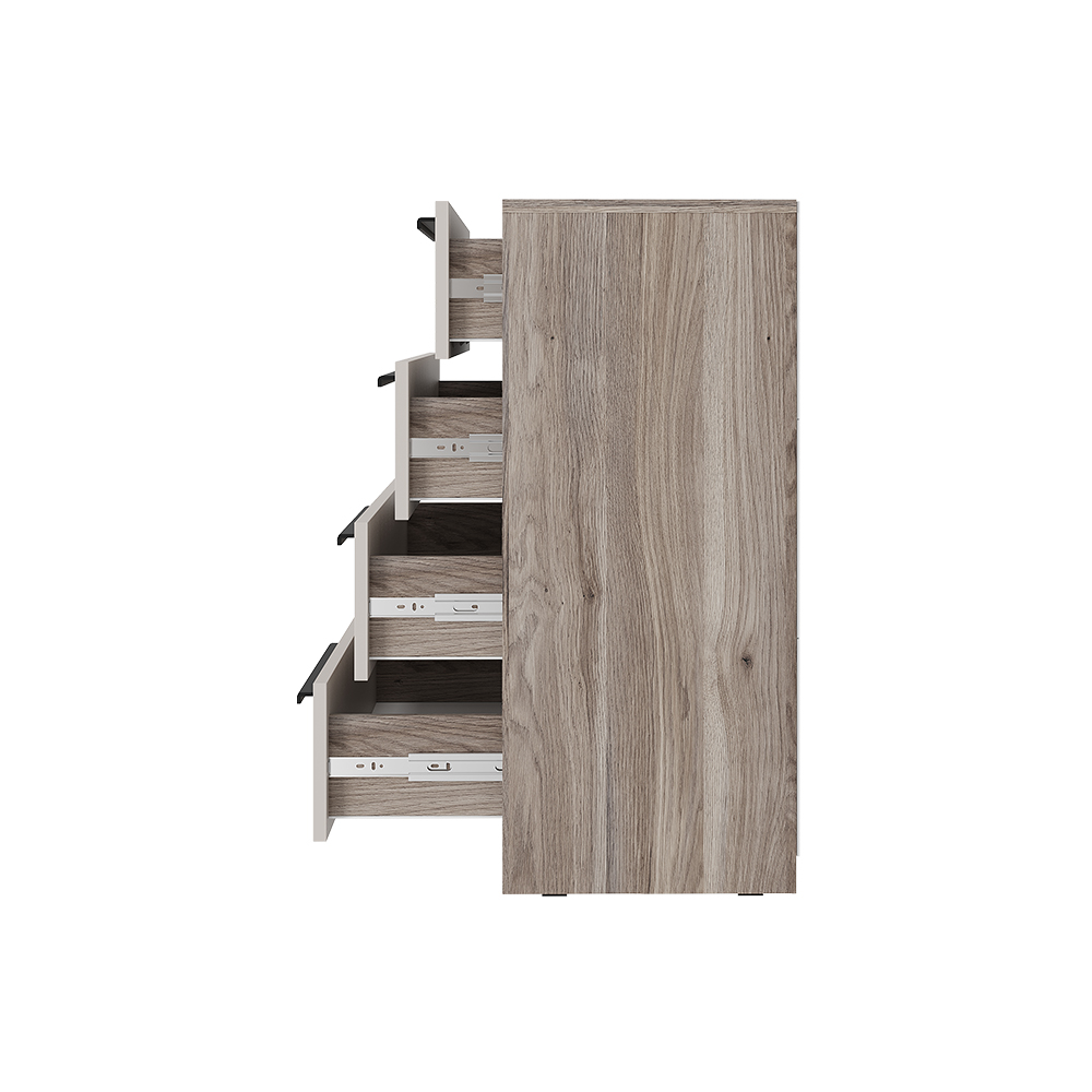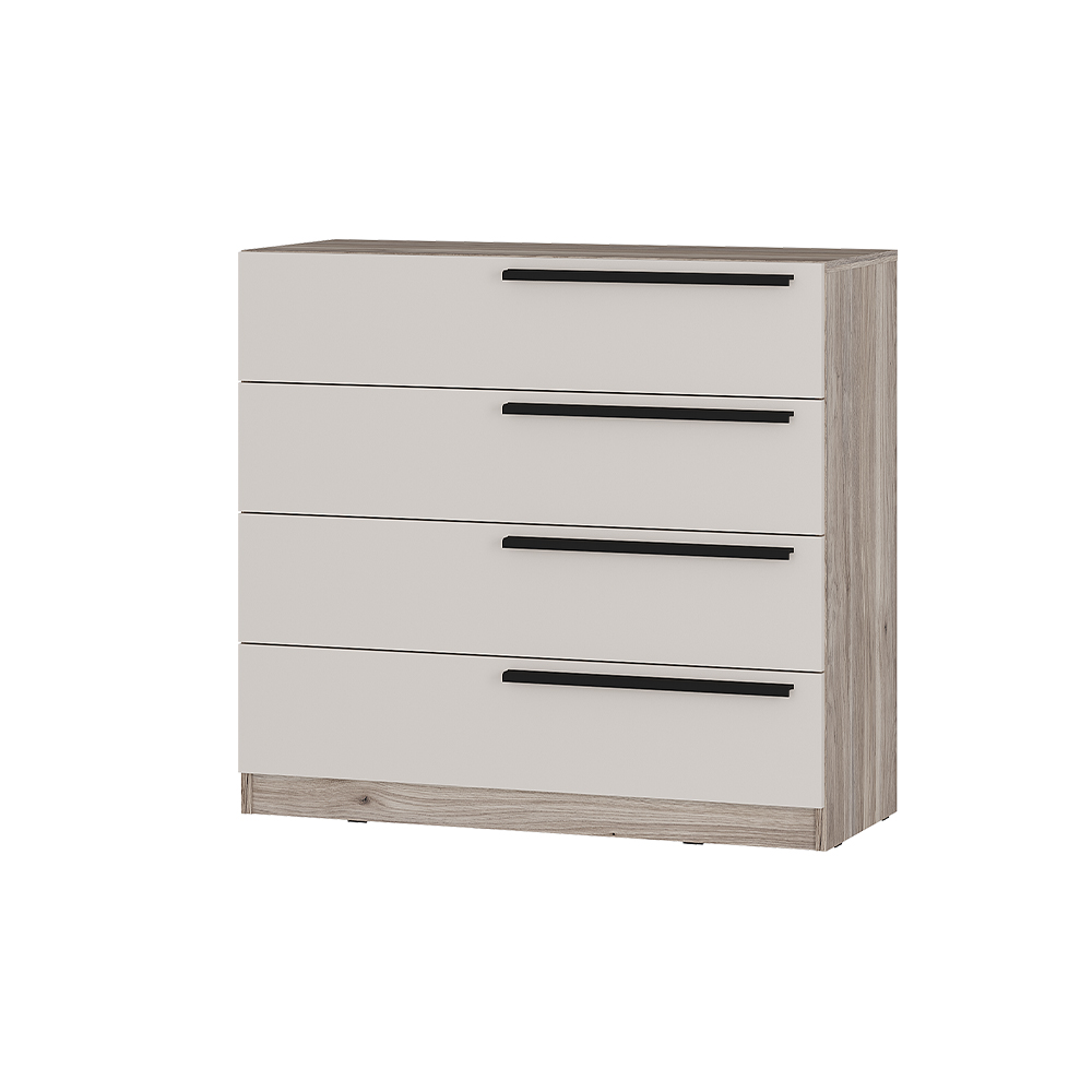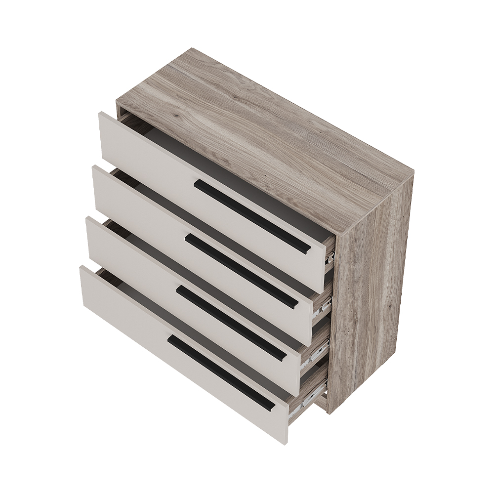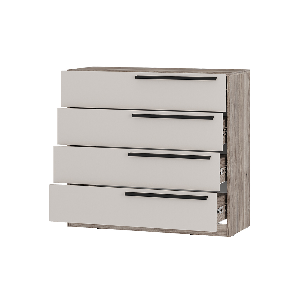 Комод состоит из 4 выдвижных ящиков на шариковых направляющих, которые позволят удобно хранить одежду, белье и прочие аксессуары.