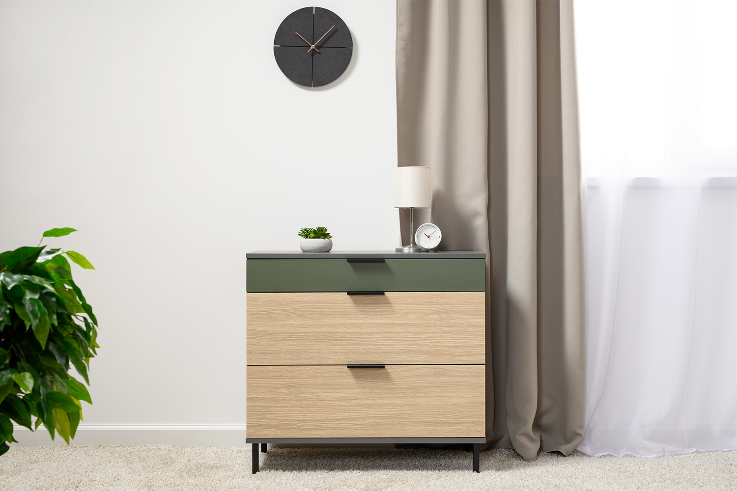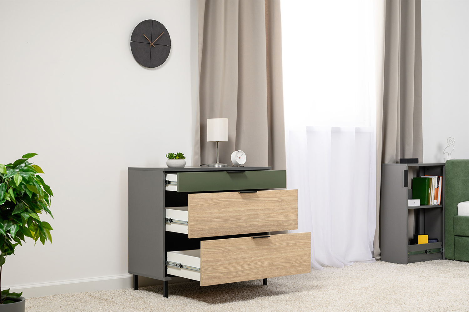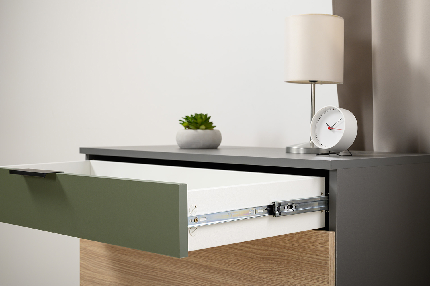Каждый ящик оснащен надежными шариковыми направляющими, обеспечивающими плавное и бесшумное открытие и закрытие. Просторные ящики позволяют удобно хранить одежду, белье или другие предметы, поддерживая порядок в доме.