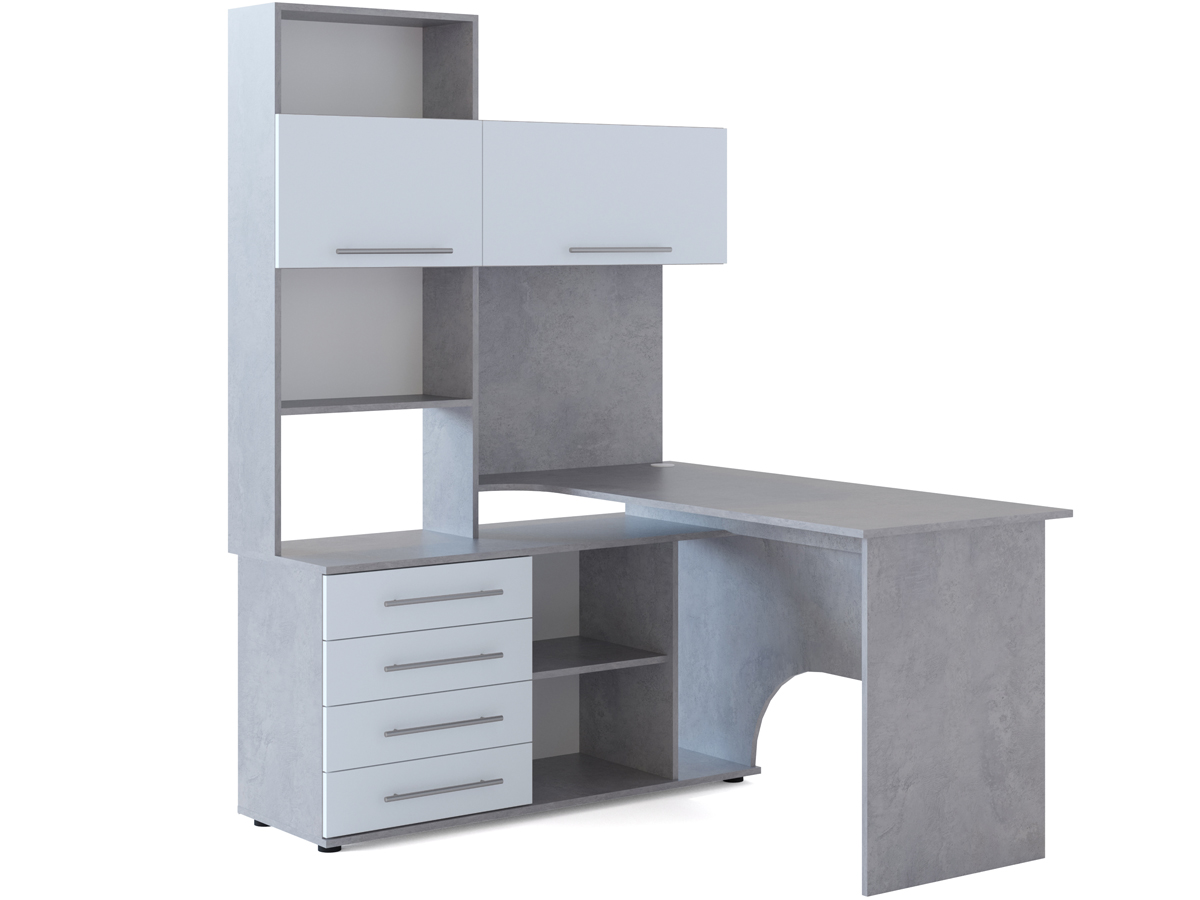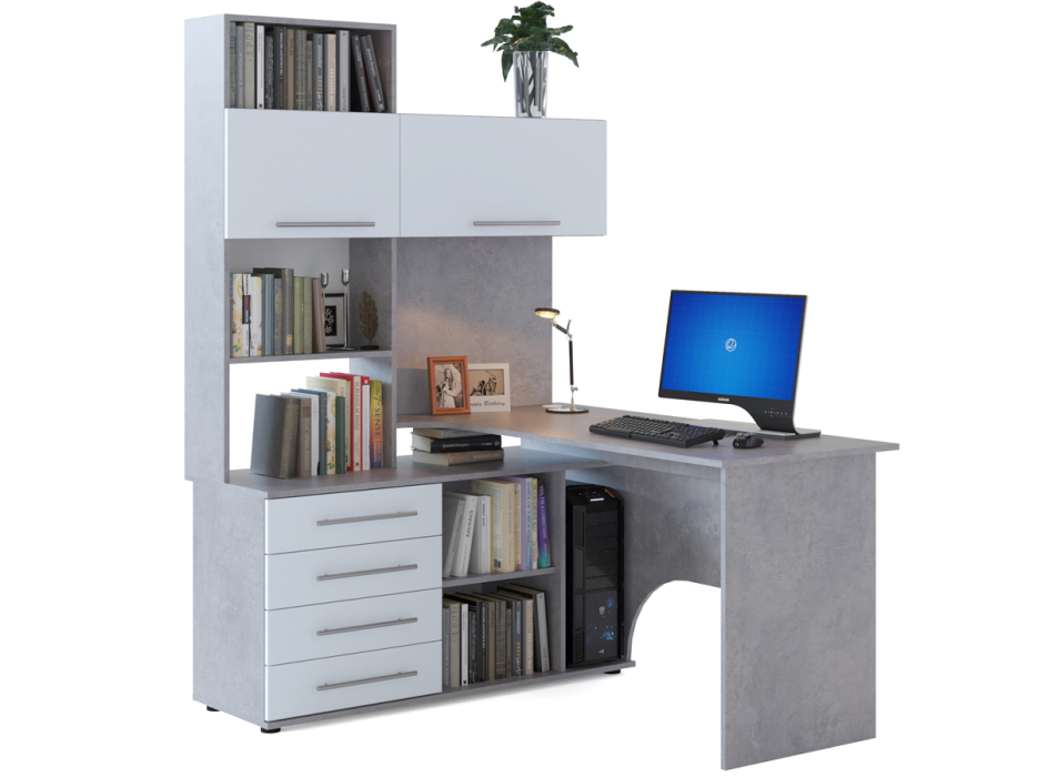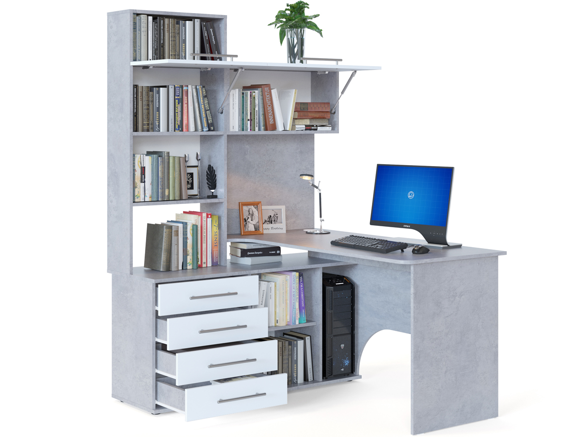 Многофункциональный компьютерный стол КСТ-14 для домашнего кабинета или офиса. Модель сочетает в себе широкий компьютерный стол с размером столешницы 1400 мм, тумбу с ящиками, полками и нишей под системный блок. Высокая надстройка имеет открытые полки и два закрытых шкафа. Двери шкафчиков открываются вверх. Внутренний размер ящиков — 456 х 346 мм.