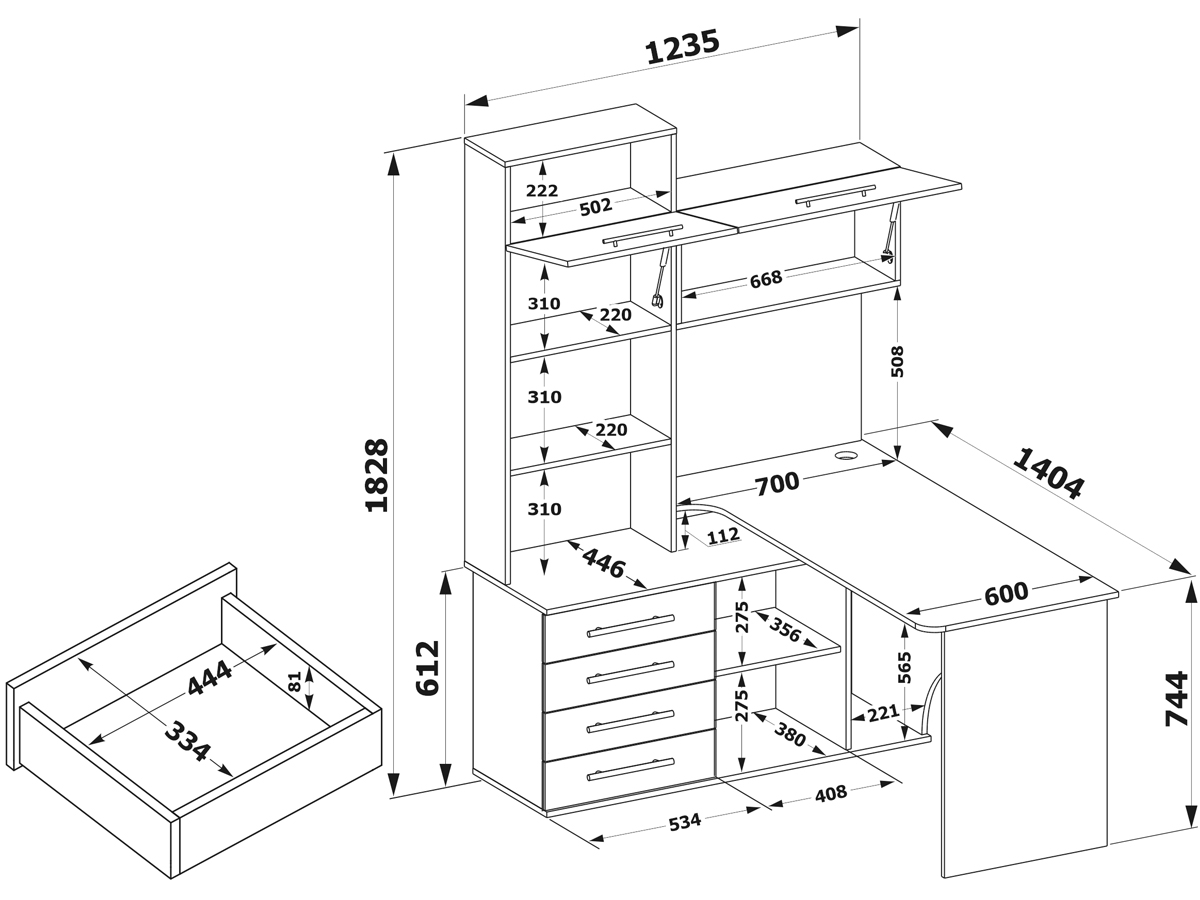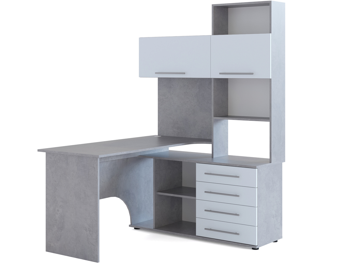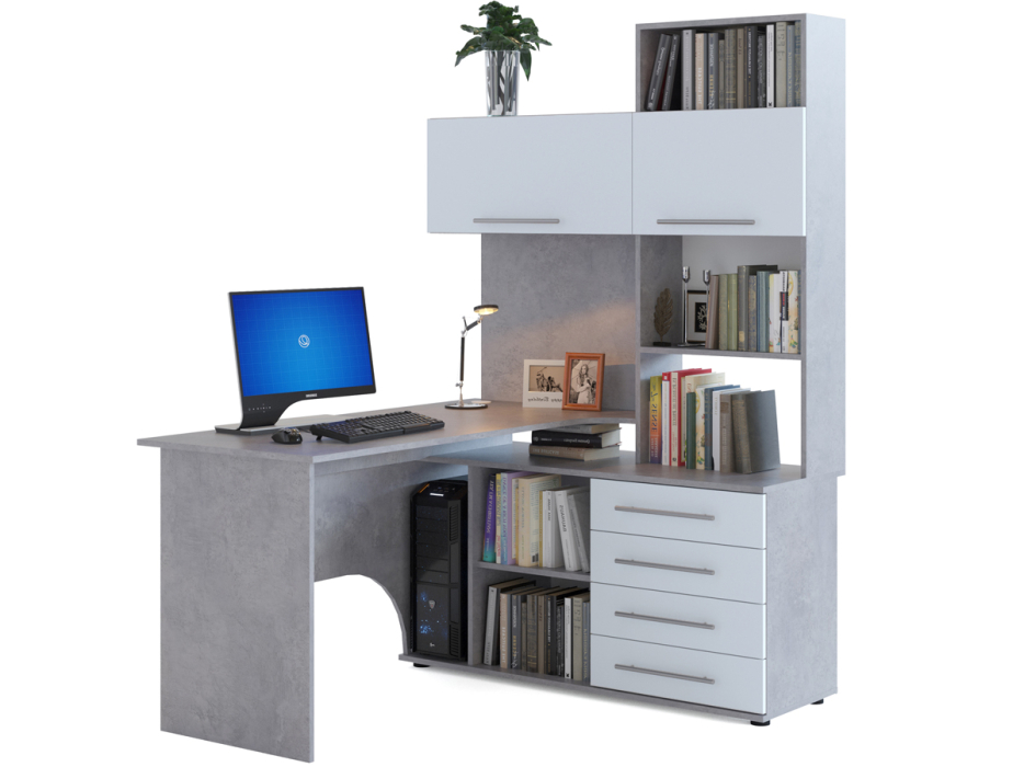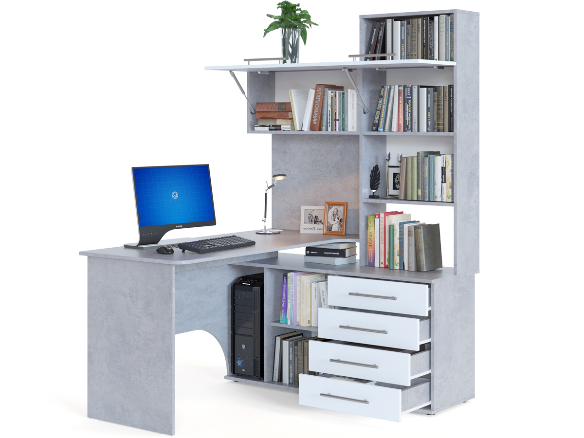 Многофункциональный компьютерный стол КСТ-14 для домашнего кабинета или офиса. Модель сочетает в себе широкий компьютерный стол с размером столешницы 1400 мм, тумбу с ящиками, полками и нишей под системный блок. Высокая надстройка имеет открытые полки и два закрытых шкафа. Двери шкафчиков открываются вверх. Внутренний размер ящиков — 456 х 346 мм.
