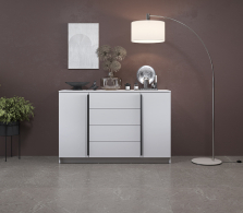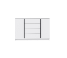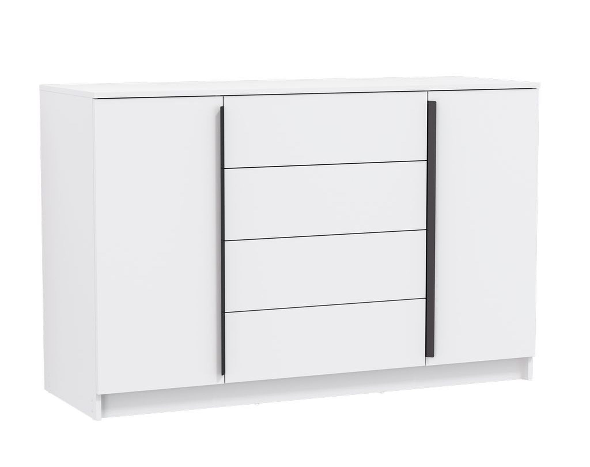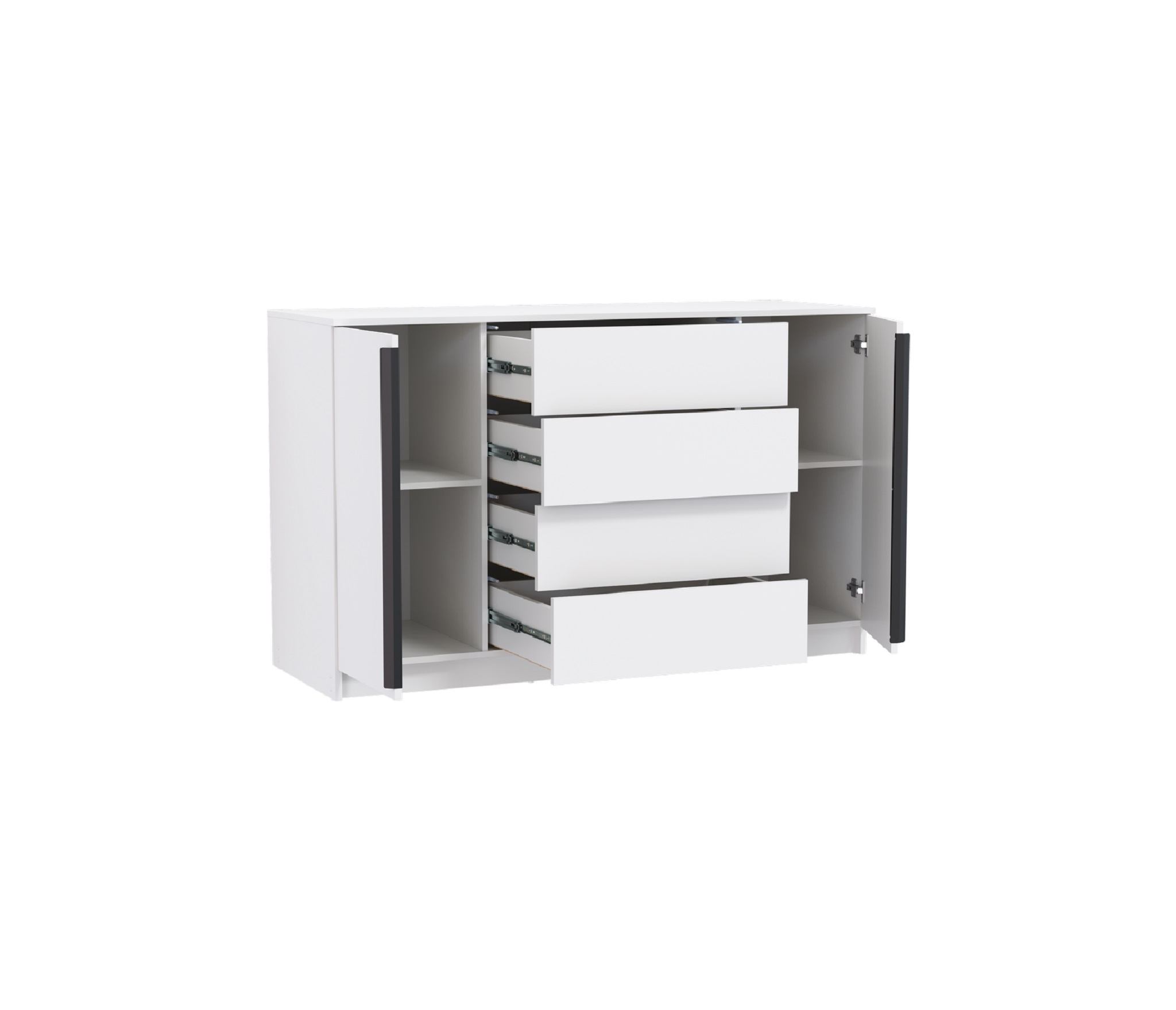 Конструкция комода с 4 выдвижными ящиками и двумя отделами для хранения с распашными дверками.