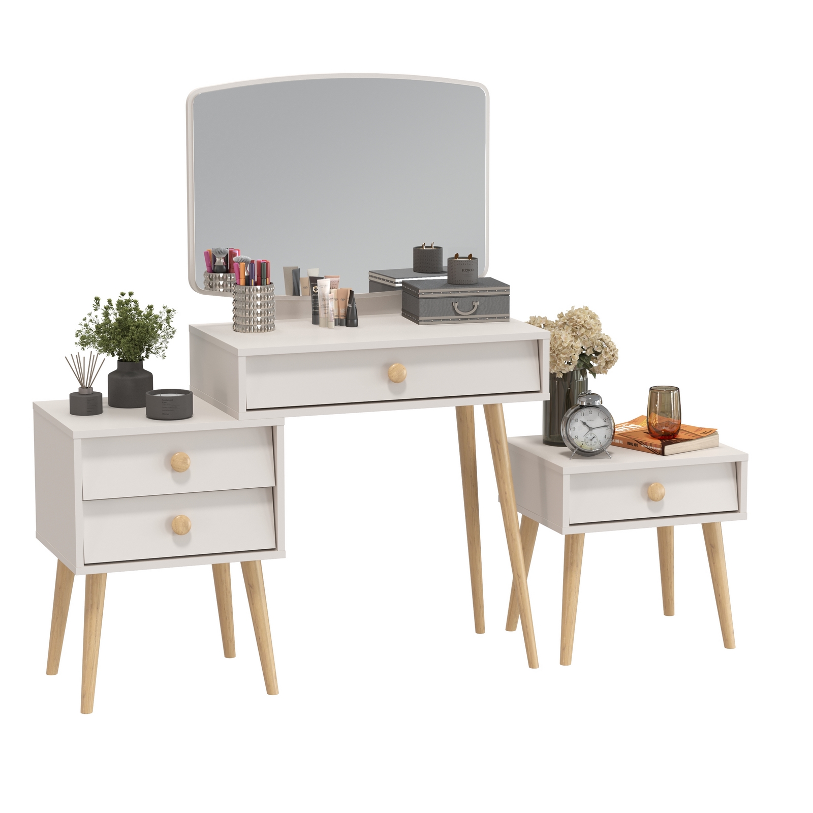 Трюмо объединяет функции туалетного столика и малой тумбы, предлагая удобные столешницы на разных уровнях для различных нужд. Оно оснащено тремя просторными выдвижными ящиками - один под столешницей столика и два в секции тумбы. Все ящики легко открываются благодаря шариковым направляющим полного выдвижения, что делает использование максимально комфортным. Большое зеркало, расположенное над столешницей туалетного столика, создаёт удобную рабочую зону для ухода за собой, а также визуально расширяет пространство. Оно идеально вписывается в общий стиль трюмо, становясь его центральным акцентом и делая процесс утренних или вечерних сборов максимально комфортным. Высота ножек у туалетного столика составляет 60 см, а у тумбы – 30 см, что подчёркивает элегантность изделия и облегчает уборку.