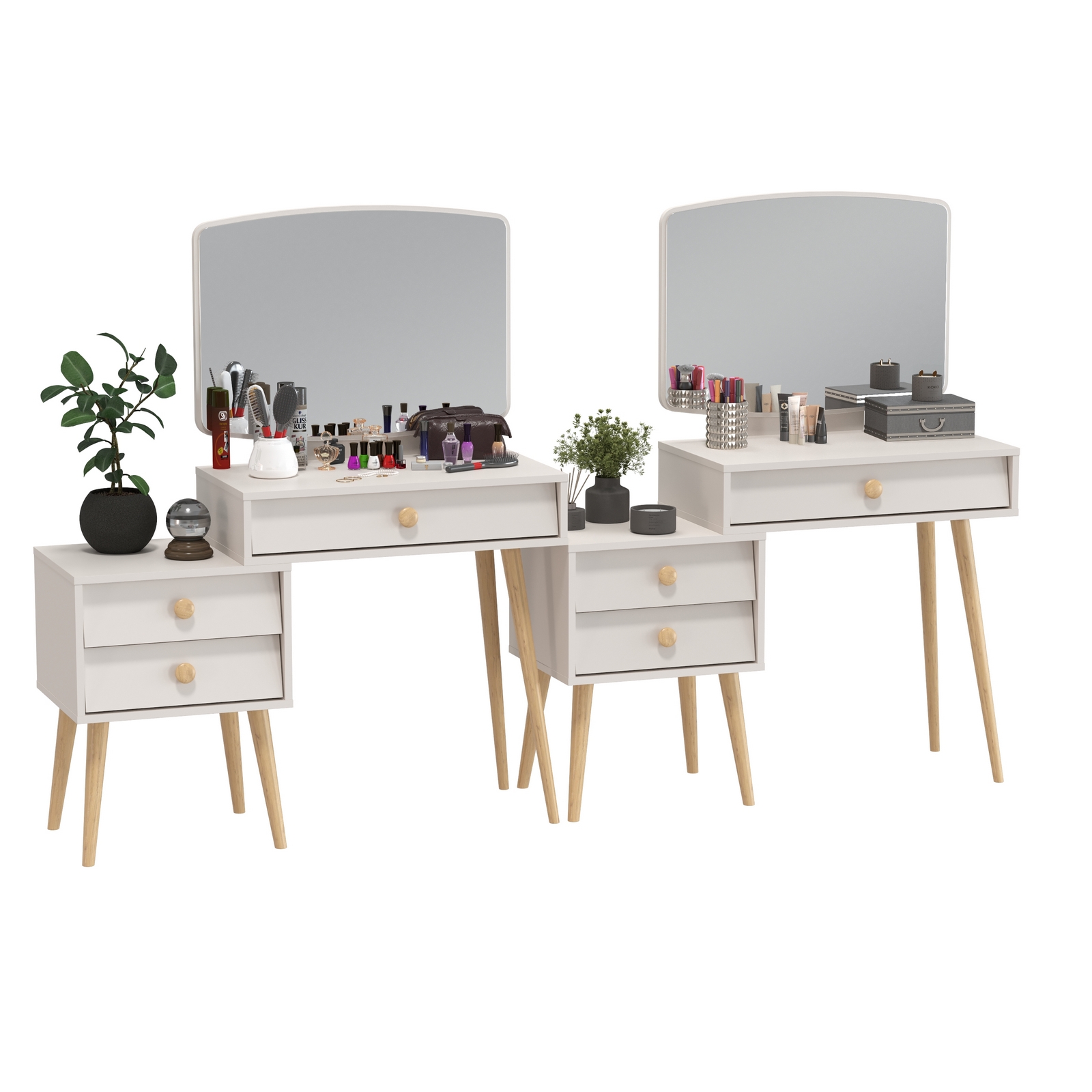 Каждое трюмо (в комплектации 2 ед.)объединяет функции туалетного столика и малой тумбы, предлагая удобные столешницы на разных уровнях для различных нужд. Оно оснащено тремя просторными выдвижными ящиками - один под столешницей столика и два в секции тумбы. Все ящики легко открываются благодаря шариковым направляющим полного выдвижения, что делает использование максимально комфортным. Большое зеркало, расположенное над столешницей туалетного столика, создаёт удобную рабочую зону для ухода за собой, а также визуально расширяет пространство. Оно идеально вписывается в общий стиль трюмо, становясь его центральным акцентом и делая процесс утренних или вечерних сборов максимально комфортным. Декоративные деревянные ручки круглой формы в цвете бук акцентируют внимание на природной эстетике и лаконичности изделия, гармонично завершая его дизайн Трюмо установлено на высокие опоры из массива бука, которые добавляют лёгкости конструкции. Высота ножек у туалетного столика составляет 60 см, а у тумбы – 30 см, что подчёркивает элегантность изделия и облегчает уборку.